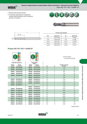 Цельные твердосплавные концевые фрезы общего назначения • Черновая/чистовая обработка Серия 4001 4011 4021 • VariMill™ GP • Центральная режущая кромка. • В таблицах представлены стандартные позиции. Дополнительные типы и покрытия доступны по запросу. Tочность изготовления D1 допуск e8 D допуск h6 ≤3 -0,014/-0,028 ≤3 0/-0,006 >3–6 -0,020/-0,038 >3–6 0/-0,008 >6–10 -0,025/-0,047 >6–10 0/-0,009 >10–18 -0,032/-0,059 >10–18 0/-0,011 >18–30 -0,040/-0,073 >18–30 0/-0,013 nnСерии 4001 4011 4021 • VariMill GP лучший выбор альтернативный выбор СБпЕлЗавПбОеКзРпЫоТкрИыЯт-и..я СплTаiвAlTNiAlN TiAlN Номер Номер Номер Номер Глубина резания заказа по каталогу заказа по каталогу D1 D Ap1 max L 5880425 40010100T004 5880387 40010100T004 1,0 3 4,00 38 5880426 40010150T005 5880388 40010150T005 1,5 3 5,00 38 5880427 40010200T006 5880389 40010200T006 2,0 3 6,30 38 5880428 40010250T007 5880390 40010250T007 2,5 3 7,00 38 5880429 40010300T009 5880391 40010300T009 3,0 3 9,50 38 — 5880392 40010350T012 3,5 4 12,00 50 5880430 40010400T012 5880393 40010400T012 4,0 4 12,00 50 5880431 40110400T019 5880395 40110400T019 4,0 4 19,00 63 5880432 40210400T031 5880396 40210400T031 4,0 4 31,00 75 5880433 40010500T014 — 5,0 5 14,00 50 — 5880397 40210500T014 5,0 6 14,00 50 5880435 40010600T020 5880398 40010600T020 6,0 6 20,00 63 5880436 40110600T028 5880399 40110600T028 6,0 6 28,00 76 5880437 40210600T038 5880400 40210600T038 6,0 6 38,00 100 5880438 40010800T020 5880401 40010800T020 8,0 8 20,00 63 5880439 40110800T028 5880402 40110800T028 8,0 8 28,00 76 5880440 40210800T040 5880403 40210800T040 8,0 8 40,00 100 5880441 40011000T022 5880404 40011000T022 10,0 10 22,00 76 5880442 40111000T032 5880405 40111000T032 10,0 10 32,00 89 5880443 40211000T045 5880406 40211000T045 10,0 10 45,00 100 (продолжение) widia.com 211 Цельные твердосплавные концевые фрезы общего назначения