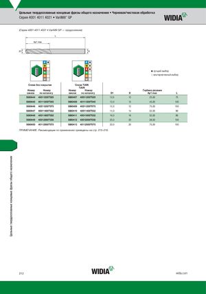 Цельные твердосплавные концевые фрезы общего назначения • Черновая/чистовая обработка Серия 4001 4011 4021 • VariMill™ GP (Серии 4001 4011 4021 • VariMill GP — продолжение) лучший выбор альтернативный выбор СБпЕлЗавПбОеКзРпЫоТкрИыЯт-и..я СплTаiвAlTNiAlN TiAlN Номер Номер Номер Номер Глубина резания заказа по каталогу заказа по каталогу D1 D Ap1 max L 5880444 40011200T025 5880407 40011200T025 12,0 12 25,00 75 5880445 40111200T045 5880408 40111200T045 12,0 12 45,00 100 5880446 40211200T075 5880409 40211200T075 12,0 12 75,00 150 5880447 40011400T032 5880410 40011400T032 14,0 14 32,00 89 5880448 40011600T032 5880411 40011600T032 16,0 16 32,00 89 5880449 40012000T038 5880412 40012000T038 20,0 20 38,00 100 5880450 40112000T075 5880413 40112000T075 20,0 20 75,00 150 ПРИМЕЧАНИЕ. Рекомендации по применению приведены на стр. 215–216. 212 widia.com Цельные твердосплавные концевые фрезы общего назначения