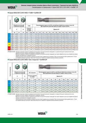 Группа материаловГруппа материалов Цельные твердосплавные концевые фрезы общего назначения Цельные твердосплавные концевые фрезы общего назначения • Черновая/чистовая обработка Рекомендации по применению • Серии D002 D012 2819 4002 • VariMill™ GP nnСерии D002 D012 2819 4002 • TiAlN • VariMill GP Обработка уступов (A)и обработка пазов (B)TiAlNРекомендуемая подача на зуб (fz = мм/зуб) для обработки уступов и стенок (A).Для прорезания пазов (B) подачу fz следует снизить на 20%. Скорость A B резания Диаметр D1 vc, м/мин ap ae ap min max мм 1,0 2,0 3,0 4,0 5,0 6,0 8,0 10,0 12,0 14,0 16,0 18,0 20,0 0 Ap1 max 0,1 × D 0,5 × D 150 – 200 fz 0,007 0,014 0,021 0,028 0,036 0,044 0,060 0,072 0,083 0,092 0,101 0,108 0,114 1 Ap1 max 0,1 × D 0,5 × D 150 – 200 fz 0,007 0,014 0,021 0,028 0,036 0,044 0,060 0,072 0,083 0,092 0,101 0,108 0,114 P 2 Ap1 max 0,1 × D 0,5 × D 140 – 190 fz 0,007 0,014 0,021 0,028 0,036 0,044 0,060 0,072 0,083 0,092 0,101 0,108 0,114 3 Ap1 max 0,1 × D 0,5 × D 120 – 160 fz 0,006 0,011 0,017 0,023 0,030 0,036 0,050 0,061 0,070 0,079 0,087 0,095 0,101 4 Ap1 max 0,1 × D 0,5 × D 90 – 150 fz 0,005 0,010 0,016 0,021 0,027 0,033 0,045 0,054 0,062 0,070 0,077 0,083 0,088 1 Ap1 max 0,1 × D 0,5 × D 90 – 115 fz 0,006 0,011 0,017 0,023 0,030 0,036 0,050 0,061 0,070 0,079 0,087 0,095 0,101 M 2 Ap1 max 0,1 × D 0,5 × D 60 – 80 fz 0,005 0,009 0,014 0,019 0,024 0,029 0,040 0,048 0,056 0,063 0,070 0,076 0,081 1 Ap1 max 0,1 × D 0,5 × D 120 – 150 fz 0,007 0,014 0,021 0,028 0,036 0,044 0,060 0,072 0,083 0,092 0,101 0,108 0,114 K 2 Ap1 max 0,1 × D 0,5 × D 110 – 140 fz 0,006 0,011 0,017 0,023 0,030 0,036 0,050 0,061 0,070 0,079 0,087 0,095 0,101 ПРИМЕЧАНИЕ. Нижнее значение скорости резания используется при выполнении операций со съемом большого припуска или при обработке более твердых материалов в пределах группы. Верхнее значение скорости резания используется при выполнении операций чистовой обработки или при обработке менее твердых материалов в пределах группы. Перечисленные выше режимы резания соответствуют идеальным условиям. При использовании фрез диаметром >12 мм на обрабатывающих центрах невысокой мощности требуется корректировка режимов резания. nnСерии D002 D012 2819 4002 • Без покрытия • VariMill GP Обработка уступов (A)и обработка пазов (B)Без покрытияРекомендуемая подача на зуб (fz = мм/зуб) для обработки уступов и стенок (A).Для прорезания пазов (B) подачу fz следует снизить на 20%. A B Скорость резанияvc, м/мин Диаметр D1 ap ae ap min max мм 2,0 3,0 4,0 6,0 8,0 10,0 12,0 16,0 20,0 0 0,1 × D 0,1 × D 0,5 × D 120 – 160 fz 0,014 0,021 0,028 0,044 0,060 0,072 0,083 0,101 0,114 P 1 0,1 × D 0,1 × D 0,5 × D 120 – 160 fz 0,014 0,021 0,028 0,044 0,060 0,072 0,083 0,101 0,114 2 0,1 × D 0,1 × D 0,5 × D 112 – 152 fz 0,014 0,021 0,028 0,044 0,060 0,072 0,083 0,101 0,114 1 Ap1 max 0,1 × D 0,5 × D 400 – 1600 fz 0,020 0,030 0,040 0,060 0,080 0,100 0,120 0,160 0,200 N 2 Ap1 max 0,1 × D 0,5 × D 400 – 1200 fz 0,016 0,024 0,032 0,048 0,064 0,080 0,096 0,128 0,160 4 Ap1 max 0,1 × D 0,5 × D 320 – 600 fz 0,014 0,021 0,028 0,042 0,056 0,070 0,084 0,112 0,140 ПРИМЕЧАНИЕ. Нижнее значение скорости резания используется при выполнении операций со съемом большого припуска или при обработке более твердых материалов в пределах группы. Верхнее значение скорости резания используется при выполнении операций чистовой обработки или при обработке менее твердых материалов в пределах группы. Перечисленные выше режимы резания соответствуют идеальным условиям. При использовании фрез диаметром >12 мм на обрабатывающих центрах невысокой мощности требуется корректировка режимов резания. widia.com 213