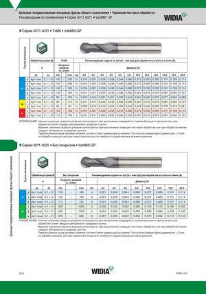 Цельные твердосплавные концевые фрезы общего назначения Группа материаловГруппа материалов Цельные твердосплавные концевые фрезы общего назначения • Черновая/чистовая обработка Рекомендации по применению • Серии 4011 4021 • VariMill™ GP nnСерии 4011 4021 • TiAlN • VariMill GP Обработка уступов (A) TiAlN Рекомендуемая подача на зуб (fz = мм/зуб) для обработки уступов и стенок (A). Скорость A резания Диаметр D1 vc, м/мин ap ae min max мм 2,0 3,0 4,0 5,0 6,0 8,0 10,0 12,0 14,0 16,0 18,0 20,0 0 Ap1 max 0,1 × D 150 – 200 fz 0,014 0,021 0,028 0,036 0,044 0,060 0,072 0,083 0,092 0,101 0,108 0,114 1 Ap1 max 0,1 × D 150 – 200 fz 0,014 0,021 0,028 0,036 0,044 0,060 0,072 0,083 0,092 0,101 0,108 0,114 P 2 Ap1 max 0,1 × D 140 – 190 fz 0,014 0,021 0,028 0,036 0,044 0,060 0,072 0,083 0,092 0,101 0,108 0,114 3 Ap1 max 0,1 × D 120 – 160 fz 0,011 0,017 0,023 0,030 0,036 0,050 0,061 0,070 0,079 0,087 0,095 0,101 4 Ap1 max 0,1 × D 90 – 150 fz 0,010 0,016 0,021 0,027 0,033 0,045 0,054 0,062 0,070 0,077 0,083 0,088 1 Ap1 max 0,1 × D 90 – 115 fz 0,011 0,017 0,023 0,030 0,036 0,050 0,061 0,070 0,079 0,087 0,095 0,101 M 2 Ap1 max 0,1 × D 60 – 80 fz 0,009 0,014 0,019 0,024 0,029 0,040 0,048 0,056 0,063 0,070 0,076 0,081 1 Ap1 max 0,1 × D 120 – 150 fz 0,014 0,021 0,028 0,036 0,044 0,060 0,072 0,083 0,092 0,101 0,108 0,114 K 2 Ap1 max 0,1 × D 110 – 140 fz 0,011 0,017 0,023 0,030 0,036 0,050 0,061 0,070 0,079 0,087 0,095 0,101 ПРИМЕЧАНИЕ. Нижнее значение скорости резания используется при выполнении операций со съемом большого припуска или при обработке более твердых материалов в пределах группы. Верхнее значение скорости резания используется при выполнении операций чистовой обработки или при обработке менее твердых материалов в пределах группы. Перечисленные выше режимы резания соответствуют идеальным условиям. При использовании фрез диаметром >12 мм на обрабатывающих центрах невысокой мощности требуется корректировка режимов резания. nnСерии 4011 4021 • Без покрытия • VariMill GP Обработка уступов (A) Без покрытия Рекомендуемая подача на зуб (fz = мм/зуб) для обработки уступов и стенок (A). A Скорость резанияvc, м/мин Диаметр D1 ap ae min max мм 3,0 4,0 6,0 8,0 10,0 12,0 16,0 20,0 0 Ap1 max 0,1 × D 120 – 160 fz 0,021 0,028 0,044 0,060 0,072 0,083 0,101 0,114 P 1 Ap1 max 0,1 × D 120 – 160 fz 0,021 0,028 0,044 0,060 0,072 0,083 0,101 0,114 2 Ap1 max 0,1 × D 112 – 152 fz 0,021 0,028 0,044 0,060 0,072 0,083 0,101 0,114 1 Ap1 max 0,1 × D 400 – 1600 fz 0,030 0,040 0,060 0,080 0,100 0,120 0,160 0,200 N 2 Ap1 max 0,1 × D 400 – 1200 fz 0,024 0,032 0,048 0,064 0,080 0,096 0,128 0,160 4 Ap1 max 0,1 × D 320 – 600 fz 0,021 0,028 0,042 0,056 0,070 0,084 0,112 0,140 ПРИМЕЧАНИЕ. Нижнее значение скорости резания используется при выполнении операций со съемом большого припуска или при обработке более твердых материалов в пределах группы. Верхнее значение скорости резания используется при выполнении операций чистовой обработки или при обработке менее твердых материалов в пределах группы. Перечисленные выше режимы резания соответствуют идеальным условиям. При использовании фрез диаметром >12 мм на обрабатывающих центрах невысокой мощности требуется корректировка режимов резания. 216 widia.com