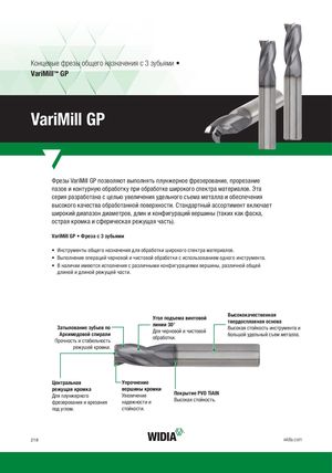 Концевые фрезы общего назначения с 3 зубьями • VariMill™ GP VariMill GP Фрезы VariMill GP позволяют выполнять плунжерное фрезерование, прорезание пазов и контурную обработку при обработке широкого спектра материалов. Эта серия разработана с целью увеличения удельного съема металла и обеспечения высокого качества обработанной поверхности. Стандартный ассортимент включает широкий диапазон диаметров, длин и конфигураций вершины (таких как фаска, острая кромка и сферическая режущая часть). VariMill GP • Фреза с 3 зубьями • Инструменты общего назначения для обработки широкого спектра материалов. • Выполнение операций черновой и чистовой обработки с использованием одного инструмента. • В наличии имеются исполнения с различными конфигурациями вершины, различной общей длиной и длиной режущей части. Затылование зубьев поАрхимедовой спиралиПрочность и стабильностьУгол подъема винтовойлинии 30°Для черновой и чистовойобработки.Высококачественнаятвердосплавная основаВысокая стойкость инструмента ибольшой удельный съем металла. режущей кромки. Центральная Упрочнение режущая кромкаДля плунжерногофрезерования и врезаниявершины кромкиУвеличениеПокрытие PVD TiAlNнадежности иВысокая стойкость. под углом. стойкости. 218 widia.com