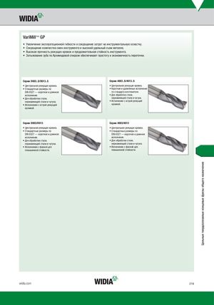 VariMill™ GP • Увеличение эксплуатационной гибкости и сокращение затрат на инструментальную оснастку. • Сокращение количества смен инструмента и высокий удельный съем металла. • Высокая прочность режущих кромок и продолжительная стойкость инструмента. • Затылование зуба по Архимедовой спирали обеспечивает простоту и экономичность переточки. Серии D003..S/D013..S Серии 4003..S/4013..S • Центральная режущая кромка. • Центральная режущая кромка. • Стандартные размеры по • Короткие и удлинённые исполнения DIN 6527 — короткое и длинное по стандарту изготовителя. исполнение. • Для обработки стали, • Для обработки стали, нержавеющей стали и чугуна. нержавеющей стали и чугуна. • Исполнение с острой режущей • Исполнение с острой режущей кромкой. кромкой. Серии D003/D013 Серии 4003/4013 • Центральная режущая кромка. • Центральная режущая кромка. • Стандартные размеры по • Стандартные размеры по DIN 6527 — короткое и длинное DIN 6527 — короткое и длинное исполнение. исполнение. • Для обработки стали, • Для обработки стали, нержавеющей стали и чугуна. нержавеющей стали и чугуна. • Исполнение с фаской для • Исполнение с фаской для повышенной стойкости. повышенной стойкости. widia.com 219 Цельные твердосплавные концевые фрезы общего назначения