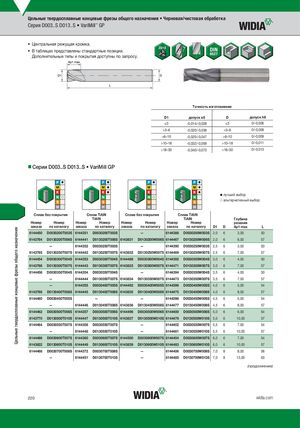 Цельные твердосплавные концевые фрезы общего назначения • Черновая/чистовая обработка Серия D003..S D013..S • VariMill™ GP • Центральная режущая кромка. • В таблицах представлены стандартные позиции. Дополнительные типы и покрытия доступны по запросу. Tочность изготовления D1 допуск e8 D допуск h6 ≤3 -0,014/-0,028 ≤3 0/-0,006 >3–6 -0,020/-0,038 >3–6 0/-0,008 >6–10 -0,025/-0,047 >6–10 0/-0,009 >10–18 -0,032/-0,059 >10–18 0/-0,011 >18–30 -0,040/-0,073 >18–30 0/-0,013 nnСерии D003..S D013..S • VariMill GP лучший выбор альтернативный выбор СпБлЕаЗв ПбеОзКпРоЫкТрИыЯтия СплTаiвAlTNiAlN СпБлЕаЗв ПбеОзКпРоЫкТрИыЯтия СплTаiвAlTNiAlN TiAlN TiAlN Глубина Номер Номер Номер Номер Номер Номер Номер Номер резания заказа по каталогу заказа по каталогу заказа по каталогу заказа по каталогу D1 D Ap1 max L 6144450 D0030200T003S 6144351 D0030200T003S — 6144388 D0030200W003S 2,0 6 3,00 50 6143764 D0130200T006S 6144441 D0130200T006S 6143831 D0130200W006S 6144467 D0130200W006S 2,0 6 6,00 57 — 6144352 D0030250T003S — 6144390 D0030250W003S 2,5 6 3,00 50 6143765 D0130250T007S 6144442 D0130250T007S 6143832 D0130250W007S 6144469 D0130250W007S 2,5 6 7,00 57 6144454 D0030300T004S 6144353 D0030300T004S 6144488 D0030300W004S 6144392 D0030300W004S 3,0 6 4,00 50 6143766 D0130300T007S 6144443 D0130300T007S 6143833 D0130300W007S 6144471 D0130300W007S 3,0 6 7,00 57 6144456 D0030350T004S 6144354 D0030350T004S — 6144394 D0030350W004S 3,5 6 4,00 50 — 6144444 D0130350T007S 6143834 D0130350W007S 6144473 D0130350W007S 3,5 6 7,00 57 — 6144355 D0030400T005S 6144492 D0030400W005S 6144396 D0030400W005S 4,0 6 5,00 54 6143768 D0130400T008S 6144445 D0130400T008S 6143835 D0130400W008S 6144475 D0130400W008S 4,0 6 8,00 57 6144460 D0030450T005S — — 6144398 D0030450W005S 4,5 6 5,00 54 — 6144446 D0130450T008S 6143836 D0130450W008S 6144477 D0130450W008S 4,5 6 8,00 57 6144462 D0030500T006S 6144357 D0030500T006S 6144496 D0030500W006S 6144400 D0030500W006S 5,0 6 6,00 54 6143770 D0130500T010S 6144447 D0130500T010S 6143837 D0130500W010S 6144479 D0130500W010S 5,0 6 10,00 57 6144464 D0030550T007S 6144358 D0030550T007S — 6144402 D0030550W007S 5,5 6 7,00 54 — 6144448 D0130550T010S — 6144481 D0130550W010S 5,5 6 10,00 57 6144466 D0030600T007S 6144360 D0030600T007S 6144500 D0030600W007S 6144404 D0030600W007S 6,0 6 7,00 54 6143822 D0130600T010S 6144449 D0130600T010S 6143839 D0130600W010S 6144483 D0130600W010S 6,0 6 10,00 57 6144468 D0030700T008S 6144372 D0030700T008S — 6144406 D0030700W008S 7,0 8 8,00 58 — 6144451 D0130700T013S — 6144485 D0130700W013S 7,0 8 13,00 63 (продолжение) 220 widia.com Цельные твердосплавные концевые фрезы общего назначения