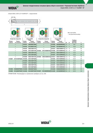 Цельные твердосплавные концевые фрезы общего назначения • Черновая/чистовая обработка Серия D003..S D013..S • VariMill™ GP (Серии D003..S D013..S • VariMill GP — продолжение) лучший выбор альтернативный выбор СпБлЕаЗв ПбеОзКпРоЫкТрИыЯтия СплTаiвAlTNiAlN СпБлЕаЗв ПбеОзКпРоЫкТрИыЯтия СплTаiвAlTNiAlN TiAlN TiAlN Глубина Номер Номер Номер Номер Номер Номер Номер Номер резания заказа по каталогу заказа по каталогу заказа по каталогу заказа по каталогу D1 D Ap1 max L — 6144374 D0030800T009S — 6144408 D0030800W009S 8,0 8 9,00 58 — 6144453 D0130800T016S — 6144487 D0130800W016S 8,0 8 16,00 63 — 6144376 D0031000T011S — 6144410 D0031000W011S 10,0 10 11,00 66 — 6144455 D0131000T019S 6143842 D0131000W019S 6144489 D0131000W019S 10,0 10 19,00 72 — 6144378 D0031200T012S — 6144412 D0031200W012S 12,0 12 12,00 73 — 6144457 D0131200T022S — 6144491 D0131200W022S 12,0 12 22,00 83 — 6144380 D0031400T014S 6144505 D0031400W014S 6144414 D0031400W014S 14,0 14 14,00 75 6143827 D0131400T022S 6144459 D0131400T022S — 6144493 D0131400W022S 14,0 14 22,00 83 — 6144382 D0031600T016S — 6144416 D0031600W016S 16,0 16 16,00 82 — 6144461 D0131600T026S — 6144495 D0131600W026S 16,0 16 26,00 92 — 6144384 D0031800T018S — 6144418 D0031800W018S 18,0 18 18,00 84 — 6144463 D0131800T026S — 6144497 D0131800W026S 18,0 18 26,00 92 6144482 D0032000T020S 6144386 D0032000T020S — 6144420 D0032000W020S 20,0 20 20,00 92 6143830 D0132000T032S 6144465 D0132000T032S 6143847 D0132000W032S 6144499 D0132000W032S 20,0 20 32,00 104 ПРИМЕЧАНИЕ. Рекомендации по применению приведены на стр. 226. widia.com 221 Цельные твердосплавные концевые фрезы общего назначения
