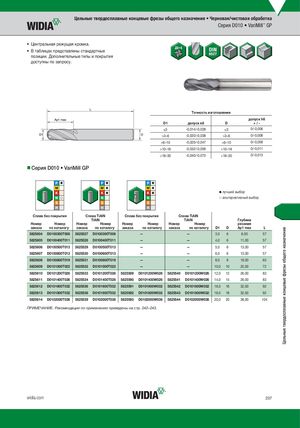 Цельные твердосплавные концевые фрезы общего назначения • Черновая/чистовая обработка Серия D010 • VariMill™ GP • Центральная режущая кромка. • В таблицах представлены стандартные позиции. Дополнительные типы и покрытия доступны по запросу. Tочность изготовления допуск h6 D1 допуск e8 D +/- ≤3 -0,014/-0,028 ≤3 0/-0,006 >3–6 -0,020/-0,038 >3–6 0/-0,008 >6–10 -0,025/-0,047 >6–10 0/-0,009 >10–18 -0,032/-0,059 >10–18 0/-0,011 >18–30 -0,040/-0,073 >18–30 0/-0,013 nnСерия D010 • VariMill GP лучший выбор альтернативный выбор СБпЕлЗавПбОеКзРпЫоТкИрыЯт-и..я СплTаiвAlTNiAlN Сплав бTеiзAlпNокрытия Сплав TiAlN TiAlN TiAlN Глубина Номер Номер Номер Номер Номер Номер Номер Номер резания заказа по каталогу заказа по каталогу заказа по каталогу заказа по каталогу D1 D Ap1 max L 5825604 D0100300T008 5825527 D0100300T008 — — 3,0 6 8,00 57 5825605 D0100400T011 5825528 D0100400T011 — — 4,0 6 11,00 57 5825606 D0100500T013 5825529 D0100500T013 — — 5,0 6 13,00 57 5825607 D0100600T013 5825530 D0100600T013 — — 6,0 6 13,00 57 5825608 D0100800T019 5825531 D0100800T019 — — 8,0 8 19,00 63 5825609 D0101000T022 5825532 D0101000T022 — — 10,0 10 22,00 72 5825610 D0101200T026 5825533 D0101200T026 5825589 D0101200W026 5825540 D0101200W026 12,0 12 26,00 83 5825611 D0101400T026 5825534 D0101400T026 5825590 D0101400W026 5825541 D0101400W026 14,0 14 26,00 83 5825612 D0101600T032 5825536 D0101600T032 5825591 D0101600W032 5825542 D0101600W032 16,0 16 32,00 92 5825613 D0101800T032 5825538 D0101800T032 5825592 D0101800W032 5825543 D0101800W032 18,0 18 32,00 92 5825614 D0102000T038 5825539 D0102000T038 5825593 D0102000W038 5825544 D0102000W038 20,0 20 38,00 104 ПРИМЕЧАНИЕ. Рекомендации по применению приведены на стр. 242–243. widia.com 237 Цельные твердосплавные концевые фрезы общего назначения