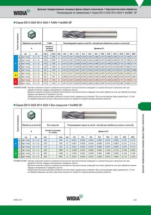 Группа материаловГруппа материалов Цельные твердосплавные концевые фрезы общего назначения Цельные твердосплавные концевые фрезы общего назначения • Черновая/чистовая обработка Рекомендации по применению • Серии D014 2528 4014 4024 • VariMill™ GP nnСерии D014 2528 4014 4024 • TiAlN • VariMill GP Обработка уступов (A) TiAlN Рекомендуемая подача на зуб (fz = мм/зуб) для обработки уступов и стенок (A). Скорость A резания Диаметр D1 vc, м/мин ap ae min max мм 2,0 3,0 4,0 5,0 6,0 8,0 10,0 12,0 14,0 16,0 18,0 20,0 0 Ap1 max 0,1 × D 150 – 200 fz 0,014 0,021 0,028 0,036 0,044 0,060 0,072 0,083 0,092 0,101 0,108 0,114 1 Ap1 max 0,1 × D 150 – 200 fz 0,014 0,021 0,028 0,036 0,044 0,060 0,072 0,083 0,092 0,101 0,108 0,114 P 2 Ap1 max 0,1 × D 140 – 190 fz 0,014 0,021 0,028 0,036 0,044 0,060 0,072 0,083 0,092 0,101 0,108 0,114 3 Ap1 max 0,1 × D 120 – 160 fz 0,011 0,017 0,023 0,030 0,036 0,050 0,061 0,070 0,079 0,087 0,095 0,101 4 Ap1 max 0,1 × D 90 – 150 fz 0,010 0,016 0,021 0,027 0,033 0,045 0,054 0,062 0,070 0,077 0,083 0,088 1 Ap1 max 0,1 × D 90 – 115 fz 0,011 0,017 0,023 0,030 0,036 0,050 0,061 0,070 0,079 0,087 0,095 0,101 M 2 Ap1 max 0,1 × D 60 – 80 fz 0,009 0,014 0,019 0,024 0,029 0,040 0,048 0,056 0,063 0,070 0,076 0,081 1 Ap1 max 0,1 × D 120 – 150 fz 0,014 0,021 0,028 0,036 0,044 0,060 0,072 0,083 0,092 0,101 0,108 0,114 K 2 Ap1 max 0,1 × D 110 – 140 fz 0,011 0,017 0,023 0,030 0,036 0,050 0,061 0,070 0,079 0,087 0,095 0,101 ПРИМЕЧАНИЕ. Нижнее значение скорости резания используется при выполнении операций со съемом большого припуска или при обработке более твердых материалов в пределах группы. Верхнее значение скорости резания используется при выполнении операций чистовой обработки или при обработке менее твердых материалов в пределах группы. Перечисленные выше режимы резания соответствуют идеальным условиям. При использовании фрез диаметром >12 мм на обрабатывающих центрах невысокой мощности требуется корректировка режимов резания. nnСерии D014 2528 4014 4024 • Без покрытия • VariMill GP Обработка уступов (A) Без покрытия Рекомендуемая подача на зуб (fz = мм/зуб) для обработки уступов и стенок (A). A Скорость резанияvc, м/мин Диаметр D1 ap ae min max мм 3,0 4,0 6,0 8,0 10,0 12,0 16,0 20,0 0 Ap1 max 0,1 × D 120 – 160 fz 0,021 0,028 0,044 0,060 0,072 0,083 0,101 0,114 P 1 Ap1 max 0,1 × D 120 – 160 fz 0,021 0,028 0,044 0,060 0,072 0,083 0,101 0,114 2 Ap1 max 0,1 × D 112 – 152 fz 0,021 0,028 0,044 0,060 0,072 0,083 0,101 0,114 1 Ap1 max 0,1 × D 400 – 1600 fz 0,030 0,040 0,060 0,080 0,100 0,120 0,160 0,200 N 2 Ap1 max 0,1 × D 400 – 1200 fz 0,024 0,032 0,048 0,064 0,080 0,096 0,128 0,160 4 Ap1 max 0,1 × D 320 – 600 fz 0,021 0,028 0,042 0,056 0,070 0,084 0,112 0,140 ПРИМЕЧАНИЕ. Нижнее значение скорости резания используется при выполнении операций со съемом большого припуска или при обработке более твердых материалов в пределах группы. Верхнее значение скорости резания используется при выполнении операций чистовой обработки или при обработке менее твердых материалов в пределах группы. Перечисленные выше режимы резания соответствуют идеальным условиям. При использовании фрез диаметром >12 мм на обрабатывающих центрах невысокой мощности требуется корректировка режимов резания. widia.com 241
