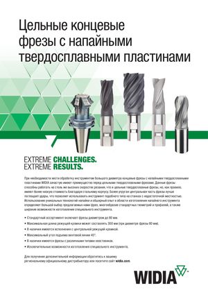 Цельные концевые фрезы с напайными твердосплавными пластинами При необходимости вести обработку инструментом большого диаметра концевые фрезы с напайными твердосплавными пластинами WIDIA зачастую имеют преимущество перед цельными твердосплавными фрезами. Данные фрезы способны работать на столь же высоких скоростях резания, что и цельные твердосплавные фрезы, но, как правило, имеют более низкую стоимость благодаря стальному корпусу. Более упругая центральная часть фрезы лучше поглощает удары, что позволяет использовать инструмент подобного типа на станках с недостаточной жесткостью. Использование уникальных технологий напайки и обширный опыт в области изготовления напайного инструмента определяют большой выбор предлагаемых нами фрез, многообразие стандартных геометрий и профилей, а также широкие возможности изготовления специального инструмента. • Стандартный ассортимент включает фрезы диаметром до 80 мм. • Максимальная длина режущей кромки может составлять 300 мм (при диаметре фрезы 80 мм). • В наличии имеются исполнения с центральной режущей кромкой. • Максимальный угол подъема винтовой линии 45°. • В наличии имеются фрезы с различными типами хвостовиков. • Исключительные возможности изготовления специального инструмента. Для получения дополнительной информации обратитесь к вашему региональному официальному дистрибьютору или посетите сайт widia.com.