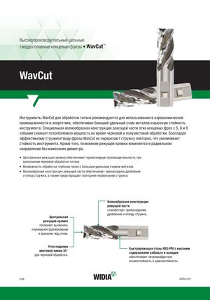 Высокопроизводительные цельные твердосплавные концевые фрезы • WavCut™ WavCut Инструменты WavCut для обработки титана рекомендуются для использования в аэрокосмической промышленности и энергетике, обеспечивая большой удельный съем металла и высокую стойкость инструмента. Специальная волнообразная конструкция режущей части этих концевых фрез с 5, 6 и 8 зубьями снижает потребляемую мощность во время черновой и получистовой обработки. Благодаря эффективному стружкоотводу фрезы WavCut не перерезают стружку повторно, что увеличивает стойкость инструмента. Кроме того, положение режущей кромки изменяется в радиальном направлении без изменения диаметра. • Центральная режущая кромка обеспечивает превосходную производительность при выполнении черновой обработки титана. • Возможность обработки глубоких пазов с большим удельным съемом металла. • Волнообразная конструкция режущей части обеспечивает превосходное дробление и отвод стружки, а также предотвращает повторное перерезание стружки. Волнообразная конструкция режущей части способствует превосходному дроблению и отводу стружки. Центральная режущая кромка позволяет выполнять плунжерное фрезерование и врезание под углом. Угол подъемавинтовой линии 35°для черновой обработки.Быстрорежущая сталь HSS-PM с высокимсодержанием кобальта и ванадияобеспечивает непревзойденную износостойкость и красностойкость. 248 widia.com