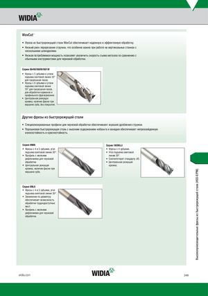 WavCut™ • Ф реза из быстрорежущей стали WavCut обеспечивает надежную и эффективную обработку. • Низкий риск перерезания стружки, что особенно важно при работе на вертикальных станках с несколькими шпинделями. • Низкая потребляемая мощность позволяет увеличить скорость съема металла по сравнению с обычными инструментами для черновой обработки. Серии 664W/660W/661W • Фрезы с 5 зубьями и углом подъема винтовой линии 35° для прорезания пазов. • Фрезы с 6 зубьями и углом подъема винтовой линии 35° для прорезания пазов, для обработки карманов и профильного фрезерования. • Центральная режущая кромка, наличие фаски при вершине зуба, без покрытия. Другие фрезы из быстрорежущей стали • Специализированные профили для черновой обработки обеспечивают хорошее дробление стружки. • Порошковая быстрорежущая сталь с высоким содержанием кобальта и ванадия обеспечивает непревзойденную износостойкость и красностойкость. Серия 6N06 Серия 1NOMJJ • Фрезы с 4 и 5 зубьями, угол • Фрезы с 4 зубьями. подъема винтовой линии 30°. • Угол подъёма винтовой • Профиль с мелкими линии 30°. рифлениями для черновой • Соответствует стандарту JIS. обработки. • Центральная режущая • Центральная режущая кромка. кромка, наличие фаски при вершине зуба. Серия 6NL6 • Фрезы с 4 и 5 зубьями, угол подъема винтовой линии 30°. • Занижение по диаметру обеспечивает возможность обработки труднодоступных мест. • Профиль с мелкими рифлениями для черновой обработки. widia.com 249 Высокопроизводительные фрезы из быстрорежущей стали (HSS-E/PM)