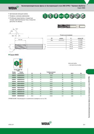 Высокопроизводительные фрезы из быстрорежущей стали (HSS-E/PM) • Черновая обработка Серия 6N06 • Центральная режущая кромка. • Профиль с мелкими рифлениями. • В таблицах представлены стандартные позиции. Дополнительные типы и покрытия доступны по запросу. Вид Х Tочность изготовления D1 допуск D допуск h6 Все +0,12/-0,12 ≤3 0/-0,006 >3–6 0/-0,008 >6–10 0/-0,009 >10–18 0/-0,011 >18–30 0/-0,013 X nnСерия 6N06 лучший выбор альтернативный выбор СплTаiвAlTNiA-LlNW-LW TiAlN Номер Номер Глубина резания заказа по каталогу D1 D Ap1 max L BCH ZU 1660373 6N0606002LW 6,0 6 13,00 57 0,25 4 1660389 6N0608004LW 8,0 10 19,00 69 0,25 4 1660397 6N0609004LW 9,0 10 19,00 69 0,25 4 1660405 6N0610004LW 10,0 10 22,00 72 0,25 4 1660421 6N0612005LW 12,0 12 26,00 83 0,35 4 1660437 6N0614005LW 14,0 12 26,00 83 0,35 4 1660453 6N0616006LW 16,0 16 32,00 92 0,35 4 1660479 6N0620007LW 20,0 20 38,00 104 0,35 4 1660487 6N0622007LW 22,0 20 38,00 104 0,50 5 1660497 6N0625008LW 25,0 25 45,00 121 0,50 5 1660507 6N0630008LW 30,0 25 45,00 121 0,50 5 ПРИМЕЧАНИЕ. Рекомендации по применению приведены на стр. 253. widia.com 251 Высокопроизводительные фрезы из быстрорежущей стали (HSS-E/PM)
