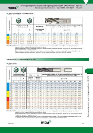 Группа материаловГруппа материалов Высокопроизводительные фрезы из быстрорежущей стали (HSS-E/PM) Высокопроизводительные фрезы из быстрорежущей стали (HSS-E/PM) • Черновая обработка Рекомендации по применению • Серии 664W 660W 661W • WavCut I™ nnСерия 664W 660W 661W • WavCut™ I Обработка уступов (A)и обработка пазов (B)Без покрытия Рекомендуемая подача на зуб (fz = мм/зуб) для обработки уступов и стенок (A). Дляпрорезания пазов (B) подачу fz следует снизить на 20%. A B Скорость резанияvc, м/мин Диаметр D1 ap ae ap min max мм 25,0 32,0 40,0 50,0 P 5 1,5 × D 0,4 × D 1×D 10 – 14 fz 0,091 0,105 0,124 0,146 1 1,5 × D 0,4 × D 1×D 10 – 14 fz 0,114 0,131 0,155 0,182 M 2 1,5 × D 0,4 × D 1×D 10 – 12 fz 0,091 0,105 0,124 0,146 3 1,5 × D 0,4 × D 0,75 × D 6 – 11 fz 0,091 0,105 0,124 0,146 S 4 1,5 × D 0,4 × D 0,75 × D 6 – 11 fz 0,084 0,096 0,114 0,134 ПРИМЕЧАНИЕ. Нижнее значение скорости резания используется при выполнении операций со съемом большого припуска или при обработке более твердых материалов в пределах группы. Верхнее значение скорости резания используется при выполнении операций чистовой обработки или при обработке менее твердых материалов в пределах группы. Верхние значения скоростей соответствуют идеальным условиям. При использовании фрез диаметром более 12 мм на обрабатывающих центрах невысокой мощности требуется корректировка табличных значений резания. Рекомендации по применению • Серия 6N06 nnСерия 6N06 Обработка уступов (A)и обработка пазов (B)TiCNTiAlN Рекомендуемая подача на зуб (fz = мм/зуб) для обработки уступов и стенок (A).Для прорезания пазов (B) подачу fz следует снизить на 20%. Скорость Скорость A B резания резания Диаметр D1 vc, м/мин vc, м/мин ap ae ap min max min max мм 6,0 8,0 10,0 12,0 16,0 18,0 20,0 25,0 30,0 1 1,5 × D 0,5 × D 1×D 56 – 64 70 – 80 fz 0,046 0,062 0,072 0,079 0,097 0,104 0,109 0,119 0,143 2 1,5 × D 0,5 × D 1×D 48 – 64 60 – 80 fz 0,046 0,062 0,072 0,079 0,097 0,104 0,109 0,119 0,143 P 3 1,5 × D 0,5 × D 1×D 40 – 56 50 – 70 fz 0,038 0,052 0,061 0,067 0,084 0,091 0,097 0,109 0,131 5 1,5 × D 0,5 × D 1×D 20 – 28 25 – 35 fz 0,031 0,042 0,048 0,054 0,067 0,073 0,078 0,087 0,105 1 1,5 × D 0,5 × D 1×D 20 – 28 25 – 35 fz 0,038 0,052 0,061 0,067 0,084 0,091 0,097 0,109 0,131 M 2 1,5 × D 0,5 × D 1×D 20 – 24 25 – 30 fz 0,031 0,042 0,048 0,054 0,067 0,073 0,078 0,087 0,105 3 1,5 × D 0,5 × D 1×D 12 – 16 15 – 20 fz 0,026 0,035 0,040 0,045 0,055 0,059 0,062 0,068 0,082 1 1,5 × D 0,5 × D 1×D 56 – 64 70 – 80 fz 0,046 0,062 0,072 0,079 0,097 0,104 0,109 0,119 0,143 K 2 1,5 × D 0,5 × D 1×D 40 – 56 50 – 70 fz 0,038 0,052 0,061 0,067 0,084 0,091 0,097 0,109 0,131 1 1,5 × D 0,5 × D 1×D 12 – 24 15 – 30 fz 0,038 0,052 0,061 0,067 0,084 0,091 0,097 0,109 0,131 2 1,5 × D 0,5 × D 1×D 4 – 12 5 – 15 fz 0,021 0,027 0,032 0,036 0,045 0,048 0,052 0,059 0,071 S 3 1,5 × D 0,5 × D 1×D 12 – 22 15 – 28 fz 0,031 0,042 0,048 0,054 0,067 0,073 0,078 0,087 0,105 4 1,5 × D 0,5 × D 1×D 12 – 22 15 – 28 fz 0,027 0,038 0,045 0,050 0,062 0,067 0,071 0,080 0,096 ПРИМЕЧАНИЕ. Нижнее значение скорости резания используется при выполнении операций со съемом большого припуска или при обработке более твердых материалов в пределах группы. Верхнее значение скорости резания используется при выполнении операций чистовой обработки или при обработке менее твердых материалов в пределах группы. Перечисленные выше режимы резания соответствуют идеальным условиям. При использовании фрез диаметром >12 мм на обрабатывающих центрах невысокой мощности требуется корректировка режимов резания. widia.com 253