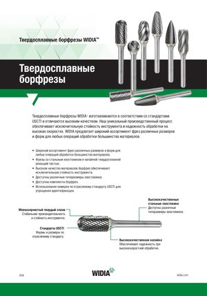 Твердосплавные борфрезы WIDIA™ Твердосплавные борфрезы Твердосплавные борфрезы WIDIA™ изготавливаются в соответствии со стандартами USCTI и отличаются высоким качеством. Наш уникальный производственный процесс обеспечивает исключительную стойкость инструмента и надежность обработки на высоких скоростях. WIDIA предлагает широкий ассортимент фрез различных размеров и форм для любых операций обработки большинства материалов. • Широкий ассортимент фрез различных размеров и форм для любых операций обработки большинства материалов. • Фрезы со стальным хвостовиком и напайной твердосплавной режущей частью. • Высокое качество материалов борфрез обеспечивает исключительную стойкость инструмента. • Доступны различные типоразмеры хвостовиков. • Доступны комплекты борфрез. • Использование номеров по отраслевому стандарту USCTI для упрощения идентификации. Высококачественные стальные хвостовики Мелкозернистый твердый сплавСтабильная производительность Доступны различныетипоразмеры хвостовиков. и стойкость инструмента. Стандарты USCTI Формы и размеры по отраслевому стандарту. Высококачественная напайка Обеспечивают надежность при высокоскоростной обработке. 258 widia.com