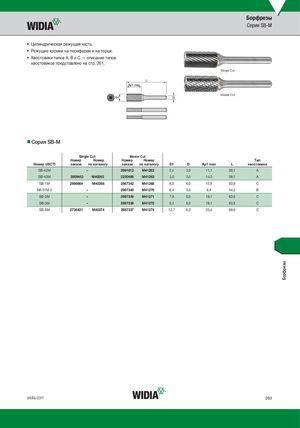 Борфрезы Серия SB-M • Цилиндрическая режущая часть. • Режущие кромки на периферии и на торце. • Хвостовики типов A, B и C — описание типов хвостовиков представлено на стр. 261. Single Cut Master Cut nnСерия SB-M Single Cut Master Cut Номер Номер Номер Номер Тип Номер USCTI заказа по каталогу заказа по каталогу D1 D Ap1 max L хвостовика SB-42M – 2991812 M41262 2,4 3,0 11,1 38,1 A SB-43M 3009453 M40263 2220466 M41263 3,0 3,0 14,3 38,1 A SB-1M 2986664 M40268 2987342 M41268 6,0 6,0 15,9 50,8 C SB-51M-2 – 2987340 M41270 6,4 3,0 6,4 44,5 B SB-2M – 2987339 M41271 7,9 6,0 19,1 63,5 C SB-3M – 2987338 M41272 9,5 6,0 19,1 63,5 C SB-5M 2736421 M40274 2987337 M41274 12,7 6,0 25,4 69,9 C widia.com 263 Борфрезы