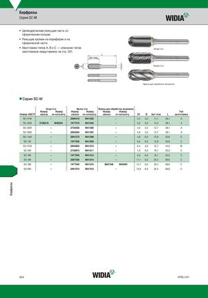 Борфрезы Серия SC-M • Ц илиндрическая режущая часть со сферическим концом. • Р ежущие кромки на периферии и на сферической части. • Хвостовики типов A, B и C — описание типов Single Cut хвостовиков представлено на стр. 261. Master Cut Фрезы для обработки алюминия nnСерия SC-M Single Cut Master Cut Фрезы для обработки алюминия Номер Номер Номер Номер Номер Номер Тип Номер USCTI заказа по каталогу заказа по каталогу заказа по каталогу D1 D Ap1 max L хвостовика SC-41M – 2990415 M41303 – 2,4 3,0 11,1 38,1 A SC-42M 2736319 M40304 1977373 M41304 – 3,0 3,0 14,3 38,1 A SC-52M – 2735503 M41306 – 4,0 3,0 12,7 38,1 A SC-53M – 2894604 M41307 – 4,8 3,0 12,7 38,1 A SC-14M – 2991273 M41308 – 4,8 6,0 15,9 50,8 C SC-1M – 1977546 M41309 – 6,0 6,0 15,9 50,8 C SC-51M – 2894603 M41310 – 6,4 3,0 12,7 44,5 B SC-2M – 2729973 M41311 – 7,9 6,0 19,1 63,5 C SC-3M – 1977548 M41312 – 9,5 6,0 19,1 63,5 C SC-4M – 2987336 M41314 – 11,1 6,0 25,4 69,9 C SC-5M – 1977549 M41316 2987349 M40561 12,7 6,0 25,4 69,9 C SC-6M – 2991274 M41318 – 15,9 6,0 25,4 69,9 C 264 widia.com Борфрезы
