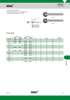 Борфрезы Серия SD-M • Сферическая режущая часть. • Хвостовики типов A, B и C — описание типов хвостовиков представлено на стр. 261. Single Cut Master Cut nnСерия SD-M Single Cut Master Cut Номер Номер Номер Номер Тип Номер USCTI заказа по каталогу заказа по каталогу D1 D Ap1 max L хвостовика SD-40M 1293470 M40342 – 1,6 3,0 1,6 38,1 A SD-41M 2656784 M40343 2729868 M41343 2,4 3,0 2,4 38,1 A SD-42M 2730572 M40344 2729863 M41344 3,0 3,0 3,0 38,1 A SD-53M – 2973335 M41345 4,8 3,0 4,8 38,1 A SD-14M – 2987335 M41346 4,8 6,0 4,8 50,8 C SD-1M 2730567 M40347 2729860 M41347 6,0 6,0 6,0 50,8 C SD-51M – 2729855 M41348 6,4 3,0 6,4 38,1 B SD-2M 2991252 M40349 2987334 M41349 7,9 6,0 7,9 51,6 C SD-3M – 2991276 M41350 9,5 6,0 9,5 52,8 C SD-4M – 2990416 M41351 11,1 6,0 11,1 54,4 C SD-5M – 2729850 M41352 12,7 6,0 12,7 56,0 C SD-5M-2 – – 12,7 8,0 12,7 62,3 C SD-6M – 3009500 M41354 15,9 6,0 15,9 58,7 C SD-6M-2 – – 15,9 8,0 15,9 65,1 C SD-7M – 2729840 M41356 19,1 6,0 19,1 61,9 C widia.com 265 Борфрезы