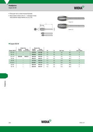 Борфрезы Серия SE-M • Режущая часть эллиптической формы. • Хвостовики типов A, B и C — описание типов хвостовиков представлено на стр. 261. Single Cut Master Cut nnСерия SE-M Single Cut Master Cut Номер Номер Номер Номер Тип Номер USCTI заказа по каталогу заказа по каталогу D1 D Ap1 max L хвостовика SE-41M – 2729793 M41368 3,0 3,0 5,6 38,1 A SE-1M – 2969583 M41372 6,0 6,0 9,5 50,8 C SE-51M 2991256 M40370 2987333 M41370 6,4 3,0 9,5 41,3 B SE-3M – 2991277 M41371 9,5 6,0 15,9 60,3 C SE-5M – 1977570 M41373 12,7 6,0 22,2 66,7 C SE-5M-2 – 3324697 M41374 12,7 8,0 25,4 76,2 C SE-6M – 2991278 M41375 15,9 6,0 25,4 69,9 C SE-7M – 2991816 M41377 19,1 6,0 25,4 69,9 C 266 widia.com Борфрезы