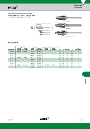 Борфрезы Серия SF-M • Режущая часть пораболической формы. • Хвостовики типов A, B и C — описание типов хвостовиков представлено на стр. 261. Single Cut Master Cut Фрезы для обработки алюминия nnСерия SF-M Single Cut Master Cut Фрезы для обработки алюминия Номер Номер Номер Номер Номер Номер Тип Номер USCTI заказа по каталогу заказа по каталогу заказа по каталогу D1 D Ap1 max L хвостовика SF-42M 2987354 M40396 1977374 M41396 – 3,0 3,0 12,7 38,1 A SF-53M – 2729701 M41397 – 4,8 3,0 12,7 38,1 B SF-1M – 2987331 M41398 – 6,0 6,0 15,9 50,8 C SF-51M 2730421 M40399 1977417 M41399 – 6,4 3,0 12,7 44,5 A SF-3M – 3526093 M41400 – 9,5 6,0 19,1 63,5 C SF-4M – 1977555 M41401 – 11,1 6,0 25,4 69,9 C SF-13M – 1293748 M41402 – 12,7 6,0 19,1 63,5 C SF-5M 2526554 M40403 1977556 M41403 1977630 M40578 12,7 6,0 25,4 69,9 C SF-6M – 2202572 M41406 – 15,9 6,0 25,4 69,9 C widia.com 267 Борфрезы