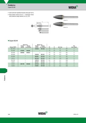 Борфрезы Серия SG-M • З аостренная параболическая режущая часть. • Хвостовики типов A, B и C — описание типов хвостовиков представлено на стр. 261. Single Cut Master Cut nnСерия SG-M Single Cut Master Cut Номер Номер Номер Номер Тип Номер USCTI заказа по каталогу заказа по каталогу D1 D Ap1 max L хвостовика SG-41M-2 – 1293463 M41428 3,0 3,0 6,4 38,1 A SG-43M 2730335 M40430 – 3,0 3,0 9,5 38,1 C SG-44M 3009465 M40431 – 3,0 3,0 12,7 38,1 C SG-44M – 1534016 M41431 3,0 3,0 12,7 38,1 A SG-53M – 2894601 M41432 4,8 3,0 12,7 38,1 A SG-1M – 2987329 M41433 6,0 6,0 15,9 50,8 C SG-51M – 1293476 M41434 6,4 3,0 12,7 69,9 B SG-2M – 2987327 M41435 7,9 6,0 19,1 63,5 C SG-3M 2981799 M40436 2987326 M41436 9,5 6,0 19,1 63,5 C SG-5M – 2729591 M41439 12,7 6,0 25,4 69,9 C 268 widia.com Борфрезы