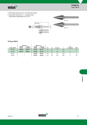 Борфрезы Серия SM-M • Коническая режущая часть с заостренным концом. • Хвостовики типов A, B и C — описание типов хвостовиков представлено на стр. 291. Single Cut Master Cut a = KRA nnСерия SM-M Single Cut Master Cut Номер Номер Номер Номер Тип Номер USCTI заказа по каталогу заказа по каталогу D1 D Ap1 max L хвостовика KRA SM-42M 2987352 M40497 1977382 M41497 3,0 3,0 11,1 38,1 A 14 SM-43M 2990413 M40498 1293468 M41498 3,0 3,0 15,9 38,1 A 7 SM-2M – 1977564 M41501 6,0 6,0 19,1 50,8 C 14 SM-5M – 1977567 M41505 12,7 6,0 22,2 69,9 C 28 widia.com 271 Борфрезы