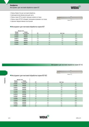 Борфрезы Инструмент для чистовой обработки серии IGT • Фрезы Master Cut для чистовой обработки. • Цилиндрическая форма режущей части. • Фрезы серии IGT не имеют режущих кромок на торце. • Фрезы серии IGT-EC обладают режущими кромками и на торце. Master Cut • Цельная твёрдосплавная конструкция. nnИнструмент для чистовой обработки серии IGT Master Cut Номер Номер заказа по каталогу D1 D Ap1 max L 2735459 M42008 2,4 3,2 4,0 38,1 2735454 M42009 2,8 3,2 4,8 38,1 2735411 M42019 3,6 4,8 5,6 50,8 2735406 M42020 4,0 4,8 5,6 50,8 2735396 M42022 4,8 4,8 6,4 50,8 2735432 M42014 6,4 6,4 7,9 50,8 Инструмент для чистовой обработки серии IGT-EC Master Cut nnИнструмент для чистовой обработки серии IGT-EC Master Cut Номер Номер заказа по каталогу D1 D Ap1 max L 2735391 M42023 1,6 3,2 3,2 38,1 2735381 M42025 2,4 3,2 4,0 38,1 2735371 M42027 3,2 3,2 4,8 38,1 2735326 M42036 3,6 4,8 5,6 50,8 2735320 M42037 4,0 4,8 5,6 50,8 2735316 M42038 4,4 4,8 6,4 50,8 2735310 M42039 4,8 4,8 6,4 50,8 2735361 M42029 5,6 6,4 7,1 50,8 2735352 M42031 6,4 6,4 7,9 50,8 2735346 M42032 7,1 6,4 8,7 63,5 2735341 M42033 7,9 6,4 8,7 63,5 2735336 M42034 8,7 6,4 9,5 63,5 2735331 M42035 9,5 6,4 9,5 63,5 272 widia.com Борфрезы