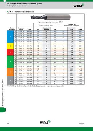 Высокопроизводительные резьбовые фрезы Рекомендации по применению nnGTM41 • Метрическое исполнение Фрезерование резьбы, снятие фаски - GTM41 Скорость резания - м/мин Подача на зуб(в зависимости от диаметра) Группа Исполнение Начальное материала фрезы Сплав min значение max <10мм >10мм 1 GTM41 R WU16PV 170 225 290 мм 0,05 0,08 2 GTM41 R WU16PV 170 225 290 мм 0,05 0,08 3 GTM41 R WU16PV 120 150 200 мм 0,03 0,05 P 4 GTM41 R WU16PV 100 125 160 мм 0,03 0,05 5 GTM41 R WU16PV 120 150 200 мм 0,03 0,04 6 GTM41 R WU16PV 60 80 100 мм 0,03 0,04 1 GTM41 R WU16PV 120 150 200 мм 0,03 0,04 M 2 GTM41 R WU16PV 120 150 200 мм 0,03 0,04 3 GTM41 R WU16PV 120 150 200 мм 0,03 0,04 1 GTM41 R WU16PV 190 250 330 мм 0,06 0,10 K 2 GTM41 R WU16PV 190 250 330 мм 0,06 0,10 3 GTM41 R WU16PV 140 185 240 мм 0,04 0,07 1 – – – – – – – – 2 GTM41 R WU16PV 180 230 300 мм 0,06 0,07 3 – – – – – – – – N 4 GTM41 R WU16PV 210 275 360 мм 0,06 0,07 5 – – – – – – – – 6 GTM41 R WU16PV 210 275 360 мм 0,06 0,07 1 GTM41 L WU16PV 120 150 200 мм 0,025 0,045 2 GTM41 L WU16PV 50 60 80 мм 0,015 0,025 S 3 GTM41 L WU16PV 50 60 80 мм 0,015 0,025 4 GTM41 L WU16PV 70 90 120 мм 0,025 0,035 1 GTM41 WU16PV 80 100 130 мм 0,030 0,050 2 GTM41 WU16PV 80 100 130 мм 0,030 0,050 H 3 GTM41 WU16PV 50 65 80 мм 0,020 0,030 4 GTM41 WU16PV 50 65 80 мм 0,020 0,030 ПРИМЕЧАНИЕ: При обработке резьб длиной от 2 x D до 3 x D следует уменьшить скорость резания и подачу на 25%. Y98 widia.com Высокопроизводительные резьбовые фрезы