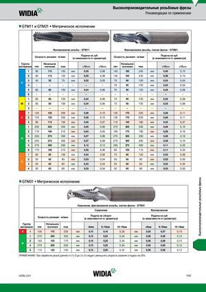 Высокопроизводительные резьбовые фрезы Рекомендации по применению nnGTM11 и GTM21 • Метрическое исполнение Фрезерование резьбы - GTM11 Фрезерование резьбы, снятие фаски - GTM21 Скорость резания - м/мин Подача на зуб(в зависимости от диаметра)Скорость резания - м/мин Подача на зуб(в зависимости от диаметра) Группа Начальное Начальное материала min значение max <10мм >10мм min значение max <10мм >10мм 1 90 115 150 мм 0,05 0,08 140 185 240 мм 0,06 0,10 2 90 115 150 мм 0,05 0,08 140 185 240 мм 0,06 0,10 3 40 50 70 мм 0,02 0,03 70 90 120 мм 0,03 0,04 P 4 – – – – – – 70 90 120 мм 0,03 0,04 5 60 80 100 мм 0,04 0,06 70 90 120 мм 0,05 0,08 6 – – – – – – – – – – – – 1 60 80 100 мм 0,04 0,06 70 90 120 мм 0,05 0,08 M 2 60 80 100 мм 0,04 0,06 70 90 120 мм 0,05 0,08 3 – – – – – – – – – – – – 1 120 150 200 мм 0,06 0,10 130 170 220 мм 0,06 0,11 K 2 120 150 200 мм 0,06 0,10 130 170 220 мм 0,06 0,11 3 90 115 150 мм 0,05 0,07 110 140 180 мм 0,05 0,07 1 200 225 250 мм 0,05 0,06 270 300 330 мм 0,08 0,16 2 170 190 210 мм 0,04 0,05 160 175 190 мм 0,08 0,16 3 250 275 300 мм 0,07 0,09 270 300 330 мм 0,08 0,16 N 4 250 275 300 мм 0,07 0,09 270 300 330 мм 0,08 0,16 5 270 300 330 мм 0,12 0,13 250 275 300 мм 0,11 0,20 6 170 190 210 мм 0,05 0,06 90 100 110 мм 0,11 0,20 1 60 80 100 мм 0,04 0,06 70 90 120 мм 0,05 0,08 2 50 65 80 мм 0,03 0,04 50 60 80 мм 0,03 0,05 S 3 50 65 80 мм 0,03 0,04 50 60 80 мм 0,03 0,05 4 50 65 80 мм 0,03 0,04 50 60 80 мм 0,03 0,05 nnGTM31 • Метрическое исполнение Сверление, фрезерование резьбы, снятие фаски - GTM31 Сверление Фрезерование Скорость резания - м/мин Подача на оборот(в зависимости от диаметра) Подача на зуб(в зависимости от диаметра) Группа Начальное материала min значение max <6мм 6–10мм 10–16мм <6мм 6–10мм 10–16мм K 1 130 175 230 мм 0,10 0,16 0,30 мм 0,05 0,07 0,10 1 270 300 330 мм 0,15 0,25 0,34 мм 0,06 0,08 0,12 2 140 150 170 мм 0,15 0,25 0,34 мм 0,06 0,08 0,12 N 4 270 300 330 мм 0,15 0,25 0,34 мм 0,06 0,08 0,12 5 110 120 130 мм 0,12 0,20 0,32 мм 0,06 0,08 0,12 ПРИМЕЧАНИЕ: При обработке резьб длиной от 2 x D до 3 x D следует уменьшить скорость резания и подачу на 25%. widia.com Y97 Высокопроизводительные резьбовые фрезы
