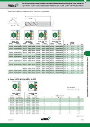 Высокопроизводительные цельные твердосплавные концевые фрезы Высокопроизводительные цельные твердосплавные концевые фрезы • Чистовая обработка Серии 022801 022804 022802 022806 322801 322804 322802 322806 422801 422804 422802 422806 (Серии 022801 022804 022802 022806 322801 322804 322802 322806 — продолжение) Вид X СплKа3в0KF30F СплKа3в0KF30F CплKа3в0KF3-T0IFC-TNiCN CплKа3в0KF3-T0IFC-TNiCN Без покрытия Без покрытия TiCN TiCN глубина номер номер номер номер номер номер номер номер резания заказа по каталогу заказа по каталогу заказа по каталогу заказа по каталогу D1 D Ap1 max L BCH 2332125 022801-000090 2332143 022802-000090 2335357 322801-000090 2335379 322802-000090 9,0 10 10,00 66 0,20 2332161 022804-000090 2332177 022806-000090 2335396 322804-000090 2335412 322806-000090 9,0 10 16,00 72 0,20 — 2332144 022802-000100 2335358 322801-000100 2335381 322802-000100 10,0 10 11,00 66 0,30 2332162 022804-000100 2332178 022806-000100 2335397 322804-000100 2335413 322806-000100 10,0 10 19,00 72 0,30 2332127 022801-000120 — 2335360 322801-000120 2335383 322802-000120 12,0 12 12,00 73 0,30 2332163 022804-000120 2332179 022806-000120 2335398 322804-000120 2335415 322806-000120 12,0 12 22,00 83 0,30 — 2332147 022802-000140 2335361 322801-000140 2335384 322802-000140 14,0 14 14,00 75 0,30 2332164 022804-000140 2332180 022806-000140 2335399 322804-000140 2335417 322806-000140 14,0 14 22,00 83 0,30 — — 2335362 322801-000160 2335385 322802-000160 16,0 16 16,00 82 0,40 2332165 022804-000160 2332181 022806-000160 2335400 322804-000160 2335420 322806-000160 16,0 16 26,00 92 0,40 — — 2335363 322801-000180 2335386 322802-000180 18,0 18 18,00 84 0,40 — 2332182 022806-000180 2335401 322804-000180 2335421 322806-000180 18,0 18 26,00 92 0,40 2332131 022801-000200 2332150 022802-000200 2335364 322801-000200 2335387 322802-000200 20,0 20 20,00 92 0,40 2332167 022804-000200 2332183 022806-000200 2335402 322804-000200 2335422 322806-000200 20,0 20 32,00 104 0,40 Серии 422801 422804 422802 422806 ⅷ лучший выбор ࠗ альтернативный выбор K30F-DCF K30F-DCF Cплав K30F-DCF Cплав K30F-DCF TiAlN TiAlN номер номер номер номер глубина резания заказа по каталогу заказа по каталогу D1 D Ap1 max L BCH 2341532 422801-000020 2341566 422802-000020 2,0 6 3,00 50 0,10 3048490 422804-000020 3048492 422806-000020 2,0 6 6,00 57 0,10 2341534 422801-000025 2341568 422802-000025 2,5 6 3,00 50 0,10 3048491 422804-000025 3048503 422806-000025 2,5 6 7,00 57 0,10 2341536 422801-000030 2341570 422802-000030 3,0 6 4,00 50 0,10 2341603 422804-000030 2341634 422806-000030 3,0 6 7,00 57 0,10 2341538 422801-000035 2341573 422802-000035 3,5 6 4,00 50 0,10 2341606 422804-000035 2341636 422806-000035 3,5 6 7,00 57 0,10 (продолжение) widia.com O89