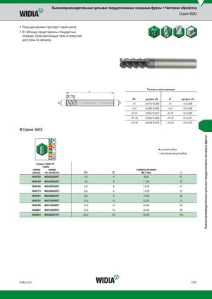 Высокопроизводительные цельные твердосплавные концевые фрезы Высокопроизводительные цельные твердосплавные концевые фрезы • Чистовая обработка Серия 4603 • Режущая кромка проходит через центр. • В таблицах представлены стандартные позиции. Дополнительные типы и покрытия доступны по запросу. Tочность изготовления D1 допуск e8 D допуск h6 )3 -0,014/-0,028 )3 0/-0,006 >3–6 -0,020/-0,038 >3–6 0/-0,008 >6–10 -0,025/-0,047 >6–10 0/-0,009 >10–18 -0,032/-0,059 >10–18 0/-0,011 >18–30 -0,040/-0,073 >18–30 0/-0,013 Серия 4603 ⅷ лучший выбор ࠗ альтернативный выбор СплTаiвAlTNiA-RlNT-RT TiAlN номер номер глубина резания заказа по каталогу D1 D Ap1 max L 1656750 460303002RT 3,0 6 8,00 57 1656758 460304002RT 4,0 6 11,00 57 1656765 460305002RT 5,0 6 13,00 57 1656773 460306002RT 6,0 6 13,00 57 1656781 460308003RT 8,0 8 19,00 63 1656791 460310004RT 10,0 10 22,00 72 1656799 460312005RT 12,0 12 26,00 83 1656807 460316006RT 16,0 16 32,00 92 1656815 460320007RT 20,0 20 38,00 104 widia.com O91