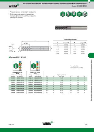 Высокопроизводительные цельные твердосплавные концевые фрезы Высокопроизводительные цельные твердосплавные концевые фрезы • Чистовая обработка Серии 422822 422826 • Режущая кромка не проходит через центр. • В таблицах представлены стандартные позиции. Дополнительные типы и покрытия доступны по запросу. Tочность изготовления D1 допуск h10 D допуск h6 Вид X )3 0/-0,040 )3 0/-0,006 >3–6 0/-0,048 >3–6 0/-0,008 >6–10 0/-0,058 >6–10 0/-0,009 >10–18 0/-0,070 >10–18 0/-0,011 >18–30 0/-0,084 >18–30 0/-0,013 Серии 422822 422826 ⅷ лучший выбор ࠗ альтернативный выбор СплKа3в0KF3-D0FC-HDPCHP СплKа3в0KF3-D0FC-HDPCHP AlTiN AlTiN номер номер номер номер глубина резания заказа по каталогу заказа по каталогу D1 D Ap1 max L BCH ZU 2342270 422822-000060 2342341 422826-000060 6,0 6 13,00 57 0,10 6 2342272 422822-000080 2342343 422826-000080 8,0 8 19,00 63 0,20 6 2342274 422822-000100 2342345 422826-000100 10,0 10 22,00 72 0,30 6 2342276 422822-000120 2342347 422826-000120 12,0 12 26,00 83 0,30 6 2342280 422822-000160 2342351 422826-000160 16,0 16 32,00 92 0,40 6 2342282 422822-000180 2342353 422826-000180 18,0 18 32,00 92 0,40 8 2342284 422822-000200 2342355 422826-000200 20,0 20 38,00 104 0,40 8 2342286 422822-000250 2342357 422826-000250 25,0 25 45,00 121 0,40 8 widia.com O93