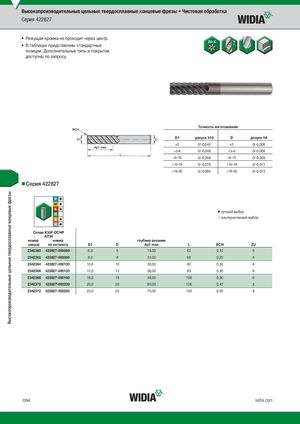 Высокопроизводительные цельные твердосплавные концевые фрезы Высокопроизводительные цельные твердосплавные концевые фрезы • Чистовая обработка Серия 422827 • Режущая кромка не проходит через центр. • В таблицах представлены стандартные позиции. Дополнительные типы и покрытия доступны по запросу. Tочность изготовления D1 допуск h10 D допуск h6 )3 0/-0,040 )3 0/-0,006 >3–6 0/-0,048 >3–6 0/-0,008 >6–10 0/-0,058 >6–10 0/-0,009 >10–18 0/-0,070 >10–18 0/-0,011 >18–30 0/-0,084 >18–30 0/-0,013 Серия 422827 ⅷ лучший выбор ࠗ альтернативный выбор CплKа3в0FK3- 0DFC-DHCPHP AlTiN номер номер глубина резания заказа по каталогу D1 D Ap1 max L BCH ZU 2342360 422827-000060 6,0 6 18,00 62 0,10 6 2342362 422827-000080 8,0 8 24,00 68 0,20 6 2342364 422827-000100 10,0 10 30,00 80 0,30 6 2342366 422827-000120 12,0 12 36,00 93 0,30 6 2342368 422827-000160 16,0 16 48,00 108 0,30 6 2342370 422827-000200 20,0 20 60,00 126 0,40 8 2342372 422827-000250 25,0 25 75,00 150 0,40 8 O94 widia.com