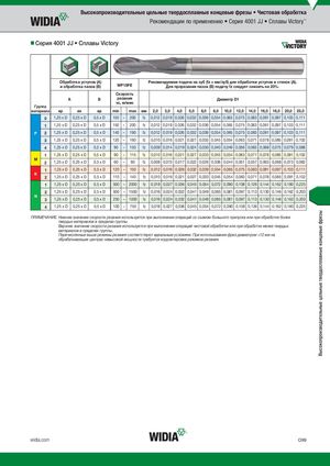 Высокопроизводительные цельные твердосплавные концевые фрезы Высокопроизводительные цельные твердосплавные концевые фрезы • Чистовая обработка Рекомендации по применению • Серия 4001 JJ • Сплавы Victory™ Серия 4001 JJ • Сплавы Victory Обработка уступов (A) Рекомендуемая подача на зуб (fz = мм/зуб) для обработки уступов и стенок (A). и обработка пазов (B) WP15PE Для прорезания пазов (B) подачу fz следует снизить на 20%. Скорость A B резания Диаметр D1 vc, м/мин Группа материала ap ae ap min max мм 2,0 3,0 4,0 5,0 6,0 8,0 10,0 12,0 14,0 16,0 18,0 20,0 25,0 0 1,25 x D 0,25 x D 0,5 x D 150 – 200 fz 0,012 0,019 0,026 0,032 0,039 0,054 0,065 0,075 0,083 0,091 0,097 0,103 0,111 1 1,25 x D 0,25 x D 0,5 x D 150 – 200 fz 0,012 0,019 0,026 0,032 0,039 0,054 0,065 0,075 0,083 0,091 0,097 0,103 0,111 P 2 1,25 x D 0,25 x D 0,5 x D 140 – 190 fz 0,012 0,019 0,026 0,032 0,039 0,054 0,065 0,075 0,083 0,091 0,097 0,103 0,111 3 1,25 x D 0,25 x D 0,5 x D 120 – 160 fz 0,010 0,016 0,021 0,027 0,033 0,045 0,054 0,063 0,071 0,078 0,085 0,091 0,102 4 1,25 x D 0,25 x D 0,3 x D 90 – 150 fz 0,009 0,014 0,019 0,024 0,030 0,040 0,049 0,056 0,063 0,069 0,075 0,079 0,088 1 1,25 x D 0,25 x D 0,5 x D 90 – 115 fz 0,010 0,016 0,021 0,027 0,033 0,045 0,054 0,063 0,071 0,078 0,085 0,091 0,102 M 2 1,25 x D 0,25 x D 0,5 x D 60 – 80 fz 0,008 0,013 0,017 0,022 0,026 0,036 0,044 0,051 0,057 0,063 0,068 0,073 0,082 1 1,25 x D 0,25 x D 0,5 x D 120 – 150 fz 0,012 0,019 0,026 0,032 0,039 0,054 0,065 0,075 0,083 0,091 0,097 0,103 0,111 K 2 1,25 x D 0,25 x D 0,5 x D 110 – 140 fz 0,010 0,016 0,021 0,027 0,033 0,045 0,054 0,063 0,071 0,078 0,085 0,091 0,102 1 1,25 x D 0,25 x D 0,5 x D 500 – 2000 fz 0,018 0,027 0,036 0,045 0,054 0,072 0,090 0,108 0,126 0,144 0,162 0,180 0,225 2 1,25 x D 0,25 x D 0,5 x D 500 – 1500 fz 0,016 0,024 0,032 0,041 0,049 0,065 0,081 0,097 0,113 0,130 0,146 0,162 0,203 N 3 1,25 x D 0,25 x D 0,5 x D 250 – 1000 fz 0,016 0,024 0,032 0,041 0,049 0,065 0,081 0,097 0,113 0,130 0,146 0,162 0,203 4 1,25 x D 0,25 x D 0,5 x D 100 – 750 fz 0,018 0,027 0,036 0,045 0,054 0,072 0,090 0,108 0,126 0,144 0,162 0,180 0,225 ПРИМЕЧАНИЕ. Нижнее значение скорости резания используется при выполнении операций со съемом большого припуска или при обработке более твердых материалов в пределах группы. Верхнее значение скорости резания используется при выполнении операций чистовой обработки или при обработке менее твердых материалов в пределах группы. Перечисленные выше режимы резания соответствуют идеальным условиям. При использовании фрез диаметром >12 мм на обрабатывающих центрах невысокой мощности требуется корректировка режимов резания. widia.com O99