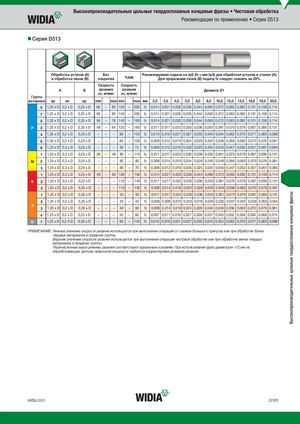 Высокопроизводительные цельные твердосплавные концевые фрезы Высокопроизводительные цельные твердосплавные концевые фрезы • Чистовая обработка Рекомендации по применению • Серия D513 Серия D513 Обработка уступов (A) Без Рекомендуемая подача на зуб (fz = мм/зуб) для обработки уступов и стенок (A). и обработка пазов (B) покрытия TiAlN Для прорезания пазов (B) подачу fz следует снизить на 20%. Скорость Скорость A B резания резания Диаметр D1 vc, м/мин vc, м/мин Группа материала ap ae ap min max min max мм 2,0 3,0 4,0 5,0 6,0 8,0 10,0 12,0 14,0 16,0 18,0 20,0 0 1,25 x D 0,2 x D 0,25 x D 60 – 80 150 – 200 fz 0,014 0,021 0,028 0,036 0,044 0,060 0,072 0,083 0,092 0,101 0,108 0,114 1 1,25 x D 0,2 x D 0,25 x D 60 – 80 150 – 200 fz 0,014 0,021 0,028 0,036 0,044 0,060 0,072 0,083 0,092 0,101 0,108 0,114 2 1,25 x D 0,2 x D 0,25 x D 56 – 76 140 – 190 fz 0,014 0,021 0,028 0,036 0,044 0,060 0,072 0,083 0,092 0,101 0,108 0,114 P 3 1,25 x D 0,2 x D 0,25 x D 48 – 64 120 – 160 fz 0,011 0,017 0,023 0,030 0,036 0,050 0,061 0,070 0,079 0,087 0,095 0,101 4 1,25 x D 0,2 x D 0,25 x D – – – 90 – 150 fz 0,010 0,016 0,021 0,027 0,033 0,045 0,054 0,062 0,070 0,077 0,083 0,088 5 1,25 x D 0,2 x D 0,25 x D – – – 60 – 100 fz 0,009 0,014 0,019 0,024 0,029 0,040 0,048 0,056 0,063 0,070 0,076 0,081 6 1,25 x D 0,2 x D 0,25 x D – – – 50 – 75 fz 0,008 0,012 0,016 0,020 0,025 0,034 0,040 0,047 0,052 0,057 0,061 0,065 1 1,25 x D 0,2 x D 0,25 x D 36 – 46 90 – 115 fz 0,011 0,017 0,023 0,030 0,036 0,050 0,061 0,070 0,079 0,087 0,095 0,101 M 2 1,25 x D 0,2 x D 0,25 x D – – – 60 – 80 fz 0,009 0,014 0,019 0,024 0,029 0,040 0,048 0,056 0,063 0,070 0,076 0,081 3 1,25 x D 0,2 x D 0,25 x D – – – 60 – 70 fz 0,008 0,012 0,016 0,020 0,025 0,034 0,040 0,047 0,052 0,057 0,061 0,065 1 1,25 x D 0,2 x D 0,25 x D 48 – 60 120 – 150 fz 0,014 0,021 0,028 0,036 0,044 0,060 0,072 0,083 0,092 0,101 0,108 0,114 K 2 1,25 x D 0,2 x D 0,25 x D – – – 110 – 140 fz 0,011 0,017 0,023 0,030 0,036 0,050 0,061 0,070 0,079 0,087 0,095 0,101 3 1,25 x D 0,2 x D 0,25 x D – – – 110 – 130 fz 0,009 0,014 0,019 0,024 0,029 0,040 0,048 0,056 0,063 0,070 0,076 0,081 1 1,25 x D 0,2 x D 0,25 x D – – – 50 – 90 fz 0,011 0,017 0,023 0,030 0,036 0,050 0,061 0,070 0,079 0,087 0,095 0,101 2 1,25 x D 0,2 x D 0,25 x D – – – 25 – 40 fz 0,006 0,009 0,013 0,016 0,019 0,026 0,032 0,037 0,042 0,046 0,050 0,054 S 3 1,25 x D 0,2 x D 0,25 x D – – – 60 – 80 fz 0,009 0,014 0,019 0,024 0,029 0,040 0,048 0,056 0,063 0,070 0,076 0,081 4 1,25 x D 0,2 x D 0,25 x D – – – 50 – 60 fz 0,007 0,011 0,016 0,021 0,026 0,037 0,045 0,052 0,058 0,064 0,069 0,074 H 1 1,25 x D 0,2 X D 0,25 x D – – – 80 – 140 fz 0,010 0,016 0,021 0,027 0,033 0,045 0,054 0,062 0,070 0,077 0,083 0,088 ПРИМЕЧАНИЕ. Нижнее значение скорости резания используется при выполнении операций со съемом большого припуска или при обработке более твердых материалов в пределах группы. Верхнее значение скорости резания используется при выполнении операций чистовой обработки или при обработке менее твердых материалов в пределах группы. Перечисленные выше режимы резания соответствуют идеальным условиям. При использовании фрез диаметром >12 мм на обрабатывающих центрах невысокой мощности требуется корректировка режимов резания. widia.com O101