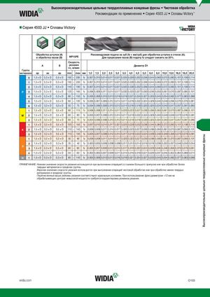 Высокопроизводительные цельные твердосплавные концевые фрезы Высокопроизводительные цельные твердосплавные концевые фрезы • Чистовая обработка Рекомендации по применению • Серия 4503 JJ • Сплавы Victory™ Серия 4503 JJ • Сплавы Victory Обработка уступов (A) Рекомендуемая подача на зуб (fz = мм/зуб) для обработки уступов и стенок (A). и обработка пазов (B) WP15PE Для прорезания пазов (B) подачу fz следует снизить на 20%. Скорость A B резания Диаметр D1 vc, м/мин Группа материала ap ae ap min max мм 1,0 1,5 2,0 2,5 3,0 3,5 4,0 4,5 5,0 6,0 8,0 10,0 12,0 16,0 18,0 20,0 0 1,5 x D 0,3 x D 0,5 x D 150 – 200 fz 0,007 0,010 0,014 0,017 0,021 0,025 0,028 0,032 0,036 0,044 0,060 0,072 0,083 0,101 0,108 0,114 1 1,5 x D 0,3 x D 0,5 x D 150 – 200 fz 0,007 0,010 0,014 0,017 0,021 0,025 0,028 0,032 0,036 0,044 0,060 0,072 0,083 0,101 0,108 0,114 2 1,5 x D 0,3 x D 0,5 x D 140 – 190 fz 0,007 0,010 0,014 0,017 0,021 0,025 0,028 0,032 0,036 0,044 0,060 0,072 0,083 0,101 0,108 0,114 P 3 1,5 x D 0,3 x D 0,5 x D 120 – 160 fz 0,006 0,008 0,011 0,014 0,017 0,020 0,023 0,027 0,030 0,036 0,050 0,061 0,070 0,087 0,095 0,101 4 1,5 x D 0,3 x D 0,3 x D 90 – 150 fz 0,005 0,008 0,010 0,013 0,016 0,019 0,021 0,024 0,027 0,033 0,045 0,054 0,062 0,077 0,083 0,088 5 1,5 x D 0,3 x D 0,5 x D 60 – 100 fz 0,005 0,007 0,009 0,012 0,014 0,017 0,019 0,022 0,024 0,029 0,040 0,048 0,056 0,070 0,076 0,081 6 1,5 x D 0,3 x D 0,3 x D 50 – 75 fz 0,004 0,006 0,008 0,010 0,012 0,014 0,016 0,018 0,020 0,025 0,034 0,040 0,047 0,057 0,061 0,065 1 1,5 x D 0,3 x D 0,5 x D 90 – 115 fz 0,006 0,008 0,011 0,014 0,017 0,020 0,023 0,027 0,030 0,036 0,050 0,061 0,070 0,087 0,095 0,101 M 2 1,5 x D 0,3 x D 0,5 x D 60 – 80 fz 0,005 0,007 0,009 0,012 0,014 0,017 0,019 0,022 0,024 0,029 0,040 0,048 0,056 0,070 0,076 0,081 3 1,5 x D 0,3 x D 0,5 x D 60 – 70 fz 0,004 0,006 0,008 0,010 0,012 0,014 0,016 0,018 0,020 0,025 0,034 0,040 0,047 0,057 0,061 0,065 1 1,5 x D 0,3 x D 0,5 x D 120 – 150 fz 0,007 0,010 0,014 0,017 0,021 0,025 0,028 0,032 0,036 0,044 0,060 0,072 0,083 0,101 0,108 0,114 K 2 1,5 x D 0,3 x D 0,5 x D 110 – 140 fz 0,006 0,008 0,011 0,014 0,017 0,020 0,023 0,027 0,030 0,036 0,050 0,061 0,070 0,087 0,095 0,101 3 1,5 x D 0,3 x D 0,5 x D 110 – 130 fz 0,005 0,007 0,009 0,012 0,014 0,017 0,019 0,022 0,024 0,029 0,040 0,048 0,056 0,070 0,076 0,081 1 1,5 x D 0,3 x D 0,3 x D 50 – 90 fz 0,006 0,008 0,011 0,014 0,017 0,020 0,023 0,027 0,030 0,036 0,050 0,061 0,070 0,087 0,095 0,101 2 1,5 x D 0,3 x D 0,3 x D 25 – 40 fz 0,003 0,005 0,006 0,008 0,009 0,011 0,013 0,014 0,016 0,019 0,026 0,032 0,037 0,046 0,050 0,054 S 3 1,5 x D 0,3 x D 0,5 x D 60 – 80 fz 0,005 0,007 0,009 0,012 0,014 0,017 0,019 0,022 0,024 0,029 0,040 0,048 0,056 0,070 0,076 0,081 4 1,5 x D 0,3 x D 0,5 x D 50 – 60 fz 0,003 0,005 0,007 0,009 0,011 0,014 0,016 0,018 0,021 0,026 0,037 0,045 0,052 0,064 0,069 0,074 H 1 1,5 x D 0,3 x D 0,3 x D 80 – 140 fz 0,005 0,008 0,010 0,013 0,016 0,019 0,021 0,024 0,027 0,033 0,045 0,054 0,062 0,077 0,083 0,088 ПРИМЕЧАНИЕ. Нижнее значение скорости резания используется при выполнении операций со съемом большого припуска или при обработке более твердых материалов в пределах группы. Верхнее значение скорости резания используется при выполнении операций чистовой обработки или при обработке менее твердых материалов в пределах группы. Перечисленные выше режимы резания соответствуют идеальным условиям. При использовании фрез диаметром >12 мм на обрабатывающих центрах невысокой мощности требуется корректировка режимов резания. widia.com O103