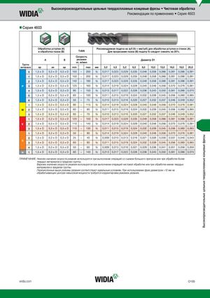 Высокопроизводительные цельные твердосплавные концевые фрезы Высокопроизводительные цельные твердосплавные концевые фрезы • Чистовая обработка Рекомендации по применению • Серия 4603 Серия 4603 Обработка уступов (A) Рекомендуемая подача на зуб (fz = мм/зуб) для обработки уступов и стенок (A). и обработка пазов (B) TiAlN Для прорезания пазов (B) подачу fz следует снизить на 20%. Скорость A B резания Диаметр D1 vc, м/мин Группа материала ap ae ap min max мм 3,0 4,0 5,0 6,0 8,0 10,0 12,0 16,0 18,0 20,0 0 1,5 x D 0,3 x D 0,5 x D 150 – 200 fz 0,017 0,023 0,029 0,035 0,048 0,058 0,066 0,081 0,086 0,091 1 1,5 x D 0,3 x D 0,5 x D 150 – 200 fz 0,017 0,023 0,029 0,035 0,048 0,058 0,066 0,081 0,086 0,091 2 1,5 x D 0,3 x D 0,5 x D 140 – 190 fz 0,017 0,023 0,029 0,035 0,048 0,058 0,066 0,081 0,086 0,091 P 3 1,5 x D 0,3 x D 0,5 x D 120 – 160 fz 0,014 0,019 0,024 0,029 0,040 0,048 0,056 0,070 0,076 0,081 4 1,5 x D 0,3 x D 0,3 x D 90 – 150 fz 0,013 0,017 0,022 0,026 0,036 0,043 0,050 0,061 0,066 0,070 5 1,5 x D 0,3 x D 0,5 x D 60 – 100 fz 0,011 0,015 0,019 0,024 0,032 0,039 0,045 0,056 0,060 0,065 6 1,5 x D 0,3 x D 0,3 x D 50 – 75 fz 0,010 0,013 0,016 0,020 0,027 0,032 0,037 0,046 0,049 0,052 1 1,5 x D 0,3 x D 0,5 x D 90 – 115 fz 0,014 0,019 0,024 0,029 0,040 0,048 0,056 0,070 0,076 0,081 M 2 1,5 x D 0,3 x D 0,5 x D 60 – 80 fz 0,011 0,015 0,019 0,024 0,032 0,039 0,045 0,056 0,060 0,065 3 1,5 x D 0,3 x D 0,5 x D 60 – 70 fz 0,010 0,013 0,016 0,020 0,027 0,032 0,037 0,046 0,049 0,052 1 1,5 x D 0,3 x D 0,5 x D 120 – 150 fz 0,017 0,023 0,029 0,035 0,048 0,058 0,066 0,081 0,086 0,091 K 2 1,5 x D 0,3 x D 0,5 x D 110 – 140 fz 0,014 0,019 0,024 0,029 0,040 0,048 0,056 0,070 0,076 0,081 3 1,5 x D 0,3 x D 0,5 x D 110 – 130 fz 0,011 0,015 0,019 0,024 0,032 0,039 0,045 0,056 0,060 0,065 1 1,5 x D 0,3 x D 0,3 x D 50 – 90 fz 0,014 0,019 0,024 0,029 0,040 0,048 0,056 0,070 0,076 0,081 2 1,5 x D 0,3 x D 0,3 x D 25 – 40 fz 0,008 0,010 0,013 0,016 0,021 0,026 0,030 0,037 0,040 0,043 S 3 1,5 x D 0,3 x D 0,3 x D 60 – 80 fz 0,011 0,015 0,019 0,024 0,032 0,039 0,045 0,056 0,060 0,065 4 1,5 x D 0,3 x D 0,5 x D 50 – 60 fz 0,009 0,013 0,016 0,021 0,029 0,036 0,041 0,051 0,056 0,059 H 1 1,5 x D 0,3 x D 0,3 x D 80 – 140 fz 0,013 0,017 0,022 0,026 0,036 0,043 0,050 0,061 0,066 0,070 ПРИМЕЧАНИЕ. Нижнее значение скорости резания используется при выполнении операций со съемом большого припуска или при обработке более твердых материалов в пределах группы. Верхнее значение скорости резания используется при выполнении операций чистовой обработки или при обработке менее твердых материалов в пределах группы. Перечисленные выше режимы резания соответствуют идеальным условиям. При использовании фрез диаметром >12 мм на обрабатывающих центрах невысокой мощности требуется корректировка режимов резания. widia.com O105