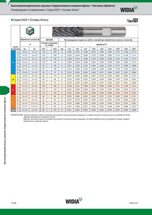 Высокопроизводительные цельные твердосплавные концевые фрезы Высокопроизводительные цельные твердосплавные концевые фрезы • Чистовая обработка Рекомендации по применению • Серия D507 • Сплавы Victory™ Серия D507 • Сплавы Victory Обработка уступов (A) WP15PE Рекомендуемая подача на зуб (fz = мм/зуб) для обработки уступов и стенок (A). Скорость резания A vc, м/мин Диаметр D1 Группа материала ap ae min max мм 4,0 6,0 8,0 10,0 12,0 14,0 16,0 18,0 20,0 0 1,0 x D 0,2 x D 150 – 200 fz 0,028 0,044 0,060 0,072 0,083 0,092 0,101 0,108 0,114 1 1,0 x D 0,2 x D 150 – 200 fz 0,028 0,044 0,060 0,072 0,083 0,092 0,101 0,108 0,114 2 1,0 x D 0,2 x D 140 – 190 fz 0,028 0,044 0,060 0,072 0,083 0,092 0,101 0,108 0,114 P 3 1,0 x D 0,1 x D 120 – 160 fz 0,023 0,036 0,050 0,061 0,070 0,079 0,087 0,095 0,101 4 1,0 x D 0,1 x D 90 – 150 fz 0,021 0,033 0,045 0,054 0,062 0,070 0,077 0,083 0,088 5 1,0 x D 0,1 x D 60 – 100 fz 0,019 0,029 0,040 0,048 0,056 0,063 0,070 0,076 0,081 6 1,0 x D 0,1 x D 50 – 75 fz 0,016 0,025 0,034 0,040 0,047 0,052 0,057 0,061 0,065 1 1,0 x D 0,1 x D 90 – 115 fz 0,023 0,036 0,050 0,061 0,070 0,079 0,087 0,095 0,101 M 2 1,0 x D 0,1 x D 60 – 80 fz 0,019 0,029 0,040 0,048 0,056 0,063 0,070 0,076 0,081 3 1,0 x D 0,1 x D 60 – 70 fz 0,016 0,025 0,034 0,040 0,047 0,052 0,057 0,061 0,065 1 1,0 x D 0,1 x D 120 – 150 fz 0,028 0,044 0,060 0,072 0,083 0,092 0,101 0,108 0,114 K 2 1,0 x D 0,1 x D 110 – 140 fz 0,023 0,036 0,050 0,061 0,070 0,079 0,087 0,095 0,101 3 1,0 x D 0,1 x D 110 – 130 fz 0,019 0,029 0,040 0,048 0,056 0,063 0,070 0,076 0,081 1 1,0 x D 0,1 x D 50 – 90 fz 0,023 0,036 0,050 0,061 0,070 0,079 0,087 0,095 0,101 2 1,0 x D 0,1 x D 25 – 40 fz 0,013 0,019 0,026 0,032 0,037 0,042 0,046 0,050 0,054 S 3 1,0 x D 0,15 x D 60 – 80 fz 0,019 0,029 0,040 0,048 0,056 0,063 0,070 0,076 0,081 4 1,0 x D 0,15 x D 50 – 60 fz 0,016 0,026 0,037 0,045 0,052 0,058 0,064 0,069 0,074 H 1 1,0 x D 0,1 x D 80 – 140 fz 0,021 0,033 0,045 0,054 0,062 0,070 0,077 0,083 0,088 ПРИМЕЧАНИЕ. Нижнее значение скорости резания используется при выполнении операций со съемом большого припуска или при обработке более твердых материалов в пределах группы. Верхнее значение скорости резания используется при выполнении операций чистовой обработки или при обработке менее твердых материалов в пределах группы. O106 widia.com