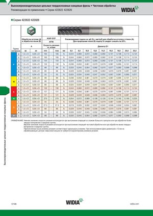 Высокопроизводительные цельные твердосплавные концевые фрезы Высокопроизводительные цельные твердосплавные концевые фрезы • Чистовая обработка Рекомендации по применению • Серии 422822 422826 Серии 422822 422826 Обработка уступов (A) K30F-DCF Рекомендуемая подача на зуб (fz = мм/зуб) для обработки уступов и стенок (A). и обработка пазов (B) AlTiN Для прорезания пазов (B) подачу fz следует снизить на 20%. A Скорость резанияvc, м/мин Диаметр D1 Группа материала ap ae min max мм 6,0 8,0 10,0 12,0 14,0 16,0 18,0 20,0 25,0 0 1,5 x D 0,05 x D 165 – 165 fz 0,044 0,060 0,072 0,083 0,092 0,101 0,108 0,114 0,124 1 1,5 x D 0,05 x D 165 – 165 fz 0,044 0,060 0,072 0,083 0,092 0,101 0,108 0,114 0,124 2 1,5 x D 0,05 x D 154 – 154 fz 0,044 0,060 0,072 0,083 0,092 0,101 0,108 0,114 0,124 P 3 1,5 x D 0,05 x D 132 – 132 fz 0,036 0,050 0,061 0,070 0,079 0,087 0,095 0,101 0,114 4 1,5 x D 0,05 x D 99 – 99 fz 0,033 0,045 0,054 0,062 0,070 0,077 0,083 0,088 0,098 5 1,5 x D 0,05 x D 66 – 66 fz 0,029 0,040 0,048 0,056 0,063 0,070 0,076 0,081 0,091 6 1,5 x D 0,04 x D 55 – 55 fz 0,025 0,034 0,040 0,047 0,052 0,057 0,061 0,065 0,071 1 1,5 x D 0,05 x D 99 – 99 fz 0,036 0,050 0,061 0,070 0,079 0,087 0,095 0,101 0,114 M 2 1,5 x D 0,05 x D 66 – 66 fz 0,029 0,040 0,048 0,056 0,063 0,070 0,076 0,081 0,091 3 1,5 x D 0,05 x D 66 – 66 fz 0,025 0,034 0,040 0,047 0,052 0,057 0,061 0,065 0,071 1 1,5 x D 0,05 x D 132 – 132 fz 0,044 0,060 0,072 0,083 0,092 0,101 0,108 0,114 0,124 K 2 1,5 x D 0,05 x D 121 – 121 fz 0,036 0,050 0,061 0,070 0,079 0,087 0,095 0,101 0,114 3 1,5 x D 0,05 x D 121 – 121 fz 0,029 0,040 0,048 0,056 0,063 0,070 0,076 0,081 0,091 N 1 1,5 x D 0,05 x D 275 – 275 fz 0,054 0,072 0,090 0,108 0,126 0,144 0,162 0,180 0,225 1 1,5 x D 0,04 x D 55 – 55 fz 0,036 0,050 0,061 0,070 0,079 0,087 0,095 0,101 0,114 2 1,5 x D 0,04 x D 27.5 – 27.5 fz 0,019 0,026 0,032 0,037 0,042 0,046 0,050 0,054 0,061 S 3 1,5 x D 0,05 x D 66 – 66 fz 0,029 0,040 0,048 0,056 0,063 0,070 0,076 0,081 0,091 4 1,5 x D 0,05 x D 55 – 55 fz 0,026 0,037 0,045 0,052 0,058 0,064 0,069 0,074 0,084 H 1 1,5 x D 0,04 x D 88 – 88 fz 0,033 0,045 0,054 0,062 0,070 0,077 0,083 0,088 0,098 ПРИМЕЧАНИЕ. Нижнее значение скорости резания используется при выполнении операций со съемом большого припуска или при обработке более твердых материалов в пределах группы. Верхнее значение скорости резания используется при выполнении операций чистовой обработки или при обработке менее твердых материалов в пределах группы. Перечисленные выше режимы резания соответствуют идеальным условиям. При использовании фрез диаметром >12 мм на обрабатывающих центрах невысокой мощности требуется корректировка режимов резания. O108 widia.com