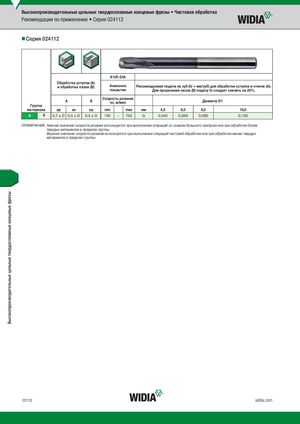 Высокопроизводительные цельные твердосплавные концевые фрезы Высокопроизводительные цельные твердосплавные концевые фрезы • Чистовая обработка Рекомендации по применению • Серия 024112 Серия 024112 K10F-DIA Обработка уступов (A) и обработка пазов (B) Алмазное Рекомендуемая подача на зуб (fz = мм/зуб) для обработки уступов и стенок (A). покрытие Для прорезания пазов (B) подачу fz следует снизить на 20%. A B Скорость резанияvc, м/мин Диаметр D1 Группа материала ap ae ap min max мм 4,0 6,0 8,0 10,0 N 6 0,7 x D 0,5 x D 0,5 x D 100 - 750 fz 0,040 0,060 0,080 0,100 ПРИМЕЧАНИЕ. Нижнее значение скорости резания используется при выполнении операций со съемом большого припуска или при обработке более твердых материалов в пределах группы. Верхнее значение скорости резания используется при выполнении операций чистовой обработки или при обработке менее твердых материалов в пределах группы. O112 widia.com