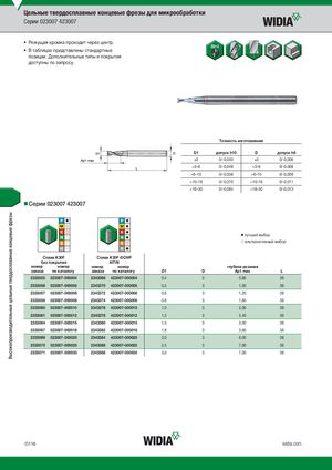 Высокопроизводительные цельные твердосплавные концевые фрезы Цельные твердосплавные концевые фрезы для микрообработки Серии 023007 423007 • Режущая кромка проходит через центр. • В таблицах представлены стандартныe позиции. Дополнительные типы и покрытия доступны по запросу. Tочность изготовления D1 допуск h10 D допуск h6 )3 0/-0,040 )3 0/-0,006 >3–6 0/-0,048 >3–6 0/-0,008 >6–10 0/-0,058 >6–10 0/-0,009 >10–18 0/-0,070 >10–18 0/-0,011 >18–30 0/-0,084 >18–30 0/-0,013 Серии 023007 423007 ⅷ лучший выбор ࠗ альтернативный выбор СплKа3в0KF30F СплKа3в0KF3-D0FC-HDPCHP без покрытия AlTiN номер номер номер номер глубина резания заказа по каталогу заказа по каталогу D1 D Ap1 max L 2333055 023007-000004 2343368 423007-000004 0,4 3 0,80 38 2333056 023007-000005 2343370 423007-000005 0,5 3 1,00 38 2333057 023007-000006 2343372 423007-000006 0,6 3 1,20 38 2333058 023007-000008 2343374 423007-000008 0,8 3 1,60 38 2333060 023007-000010 2343376 423007-000010 1,0 3 2,00 38 2333061 023007-000012 2343378 423007-000012 1,2 3 2,40 38 2333064 023007-000015 2343380 423007-000015 1,5 3 3,00 38 2333067 023007-000018 2343382 423007-000018 1,8 3 3,60 38 2333069 023007-000020 2343384 423007-000020 2,0 3 6,00 38 2333070 023007-000025 2343386 423007-000025 2,5 3 7,00 38 2333071 023007-000030 2343388 423007-000030 3,0 3 7,00 38 O116 widia.com