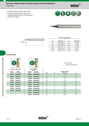 Высокопроизводительные цельные твердосплавные концевые фрезы Цельные твердосплавные концевые фрезы для микрообработки Серия 4633 • Режущая кромка проходит через центр. • В таблицах представлены стандартные позиции. Дополнительные типы и покрытия доступны по запросу. Tочность изготовления D1 допуск e8 D допуск h6 )3 -0,014/-0,028 )3 0/-0,006 >3–6 -0,020/-0,038 >3–6 0/-0,008 >6–10 -0,025/-0,047 >6–10 0/-0,009 >10–18 -0,032/-0,059 >10–18 0/-0,011 >18–30 -0,040/-0,073 >18–30 0/-0,013 Серия 4633 ⅷ лучший выбор ࠗ альтернативный выбор СБпЕлЗавПбОеКзРпЫоТкИрыЯт-и..я СплTаiвAlTNiA-RlNT-RT TiAlN номер номер номер номер глубина резания заказа по каталогу заказа по каталогу D1 D Ap1 max L 1656873 463300400.. 1656875 463300400RT 0,4 3 1,50 38 1656878 463300500.. 1656880 463300500RT 0,5 3 1,50 38 1656883 463300600.. 1656885 463300600RT 0,6 3 1,50 38 1656888 463300800.. 1656890 463300800RT 0,8 3 1,50 38 1656893 463301000.. 1656895 463301000RT 1,0 3 2,00 38 1656898 463301200.. 1656900 463301200RT 1,2 3 2,00 38 1656901 463301500.. 1656903 463301500RT 1,5 3 2,00 38 1656906 463301800.. 1656908 463301800RT 1,8 3 2,00 38 1656909 463302000.. 1656910 463302000RT 2,0 3 8,00 38 — 1656913 463302500RT 2,5 3 9,00 38 — 1656916 463303000RT 3,0 3 12,00 38 O118 widia.com