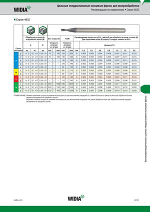 Высокопроизводительные цельные твердосплавные концевые фрезы Цельные твердосплавные концевые фрезы для микрообработки Рекомендации по применению • Серия 4632 Серия 4632 Обработка уступов (A) Рекомендуемая подача на зуб (fz = мм/зуб) для обработки уступов и стенок (A). и обработка пазов (B) Без покрытия TiAlN Для прорезания пазов (B) подачу fz следует снизить на 20%. Скорость Скорость A B резания резания Диаметр D1 vc, м/мин vc, м/мин Группа материала ap ae ap min max min max мм 0,4 0,5 0,6 0,8 1,0 1,5 2,0 0 1xD 0,1 x D 0,25 x D 75 – 100 150 – 200 fz 0,003 0,004 0,004 0,006 0,007 0,011 0,015 1 1xD 0,1 x D 0,25 x D 75 – 100 150 – 200 fz 0,003 0,004 0,004 0,006 0,007 0,011 0,015 P 2 1xD 0,1 x D 0,25 x D – – – 140 – 190 fz 0,003 0,004 0,004 0,006 0,007 0,011 0,015 3 1xD 0,1 x D 0,25 x D – – – 120 – 160 fz 0,002 0,003 0,004 0,005 0,006 0,009 0,012 4 1xD 0,1 x D 0,25 x D – – – 90 – 150 fz 0,002 0,003 0,003 0,005 0,006 0,009 0,012 1 1xD 0,1 x D 0,25 x D – – – 90 – 115 fz 0,002 0,003 0,004 0,005 0,006 0,009 0,012 M 2 1xD 0,1 x D 0,25 x D – – – 60 – 80 fz 0,002 0,003 0,003 0,004 0,005 0,008 0,010 1 1xD 0,1 x D 0,25 x D – – – 120 – 150 fz 0,003 0,004 0,004 0,006 0,007 0,011 0,015 K 2 1xD 0,1 x D 0,25 x D – – – 110 – 140 fz 0,002 0,003 0,004 0,005 0,006 0,009 0,012 1 1xD 0,1 x D 0,25 x D 250 – 1000 500 – 2000 fz 0,004 0,006 0,007 0,009 0,011 0,017 0,022 N 2 1xD 0,1 x D 0,25 x D 250 – 750 500 – 1500 fz 0,004 0,005 0,006 0,008 0,010 0,015 0,020 5 1xD 0,1 x D 0,25 x D 125 – 400 250 – 1000 fz 0,004 0,005 0,006 0,008 0,010 0,015 0,020 ПРИМЕЧАНИЕ. Нижнее значение скорости резания используется при выполнении операций со съемом большого припуска или при обработке более твердых материалов в пределах группы. Верхнее значение скорости резания используется при выполнении операций чистовой обработки или при обработке менее твердых материалов в пределах группы. widia.com O121