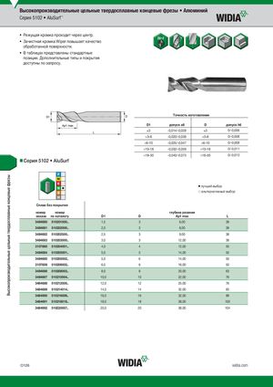 Высокопроизводительные цельные твердосплавные концевые фрезы Высокопроизводительные цельные твердосплавные концевые фрезы • Алюминий Серия 5102 • AluSurf™ • Режущая кромка проходит через центр. • Зачистная кромка Wiper повышает качество обработанной поверхности. • В таблицах представлены стандартные позиции. Дополнительные типы и покрытия доступны по запросу. Tочность изготовления D1 допуск e8 D допуск h6 )3 -0,014/-0,028 )3 0/-0,006 >3–6 -0,020/-0,038 >3–6 0/-0,008 >6–10 -0,025/-0,047 >6–10 0/-0,009 >10–18 -0,032/-0,059 >10–18 0/-0,011 >18–30 -0,040/-0,073 >18–30 0/-0,013 Серия 5102 • AluSurf ⅷ лучший выбор ࠗ альтернативный выбор СпБлЕаЗв ПбеОзКпРоЫкрТыИтЯия номер номер глубина резания заказа по каталогу D1 D Ap1 max L 3484680 510201500.. 1,5 3 6,00 38 3484681 510202000.. 2,0 3 8,00 38 3484682 510202500.. 2,5 3 9,00 38 3484683 510203000.. 3,0 3 12,00 38 3107860 510204001.. 4,0 4 12,00 50 3484684 510205001.. 5,0 5 14,00 50 3484685 510205002.. 5,0 6 14,00 50 3107859 510206002.. 6,0 6 16,00 50 3484686 510208003.. 8,0 8 20,00 63 3484687 510210004.. 10,0 10 22,00 76 3484688 510212005.. 12,0 12 25,00 76 3484689 510214014.. 14,0 14 32,00 83 3484690 510216006.. 16,0 16 32,00 89 3484691 510218018.. 18,0 18 38,00 100 3484692 510220007.. 20,0 20 38,00 104 O126 widia.com