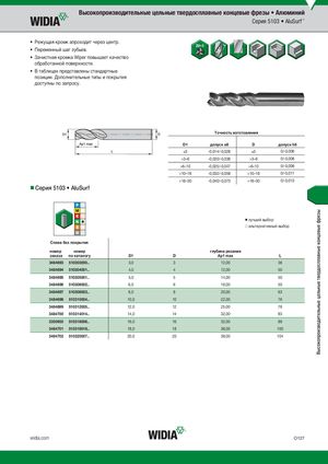 Высокопроизводительные цельные твердосплавные концевые фрезы Высокопроизводительные цельные твердосплавные концевые фрезы • Алюминий Серия 5103 • AluSurf™ • Режущая кромк апроходит через центр. • Переменный шаг зубьев. • Зачистная кромка Wiper повышает качество обработанной поверхности. • В таблицах представлены стандартные позиции. Дополнительные типы и покрытия доступны по запросу. Tочность изготовления D1 допуск e8 D допуск h6 )3 -0,014/-0,028 )3 0/-0,006 >3–6 -0,020/-0,038 >3–6 0/-0,008 >6–10 -0,025/-0,047 >6–10 0/-0,009 >10–18 -0,032/-0,059 >10–18 0/-0,011 >18–30 -0,040/-0,073 >18–30 0/-0,013 Серия 5103 • AluSurf ⅷ лучший выбор ࠗ альтернативный выбор СпБлЕаЗв бПеОзКпРоЫкрТыИтЯия номер номер глубина резания заказа по каталогу D1 D Ap1 max L 3484693 510303000.. 3,0 3 12,00 38 3484694 510304001.. 4,0 4 12,00 50 3484695 510305001.. 5,0 5 14,00 50 3484696 510306002.. 6,0 6 16,00 50 3484697 510308003.. 8,0 8 20,00 63 3484698 510310004.. 10,0 10 22,00 76 3484699 510312005.. 12,0 12 25,00 76 3484700 510314014.. 14,0 14 32,00 83 3350935 510316006.. 16,0 16 32,00 89 3484701 510318018.. 18,0 18 38,00 100 3484702 510320007.. 20,0 20 38,00 104 widia.com O127