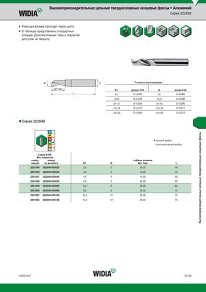 Высокопроизводительные цельные твердосплавные концевые фрезы Высокопроизводительные цельные твердосплавные концевые фрезы • Алюминий Серия 022849 • Режущая кромка проходит через центр. • В таблицах представлены стандартные позиции. Дополнительные типы и покрытия доступны по запросу. Tочность изготовления D1 допуск h10 D допуск h6 )3 0/-0,040 )3 0/-0,006 >3–6 0/-0,048 >3–6 0/-0,008 >6–10 0/-0,058 >6–10 0/-0,009 >10–18 0/-0,070 >10–18 0/-0,011 >18–30 0/-0,084 >18–30 0/-0,013 Серия 022849 ⅷ лучший выбор ࠗ альтернативный выбор CплKа1в0KF10F Без покрытия номер номер глубина резания заказа по каталогу D1 D Ap1 max L 2281545 022849-000020 2,0 2 10,00 40 2281546 022849-000030 3,0 3 10,00 40 2281547 022849-000040 4,0 4 14,00 50 2281548 022849-000050 5,0 5 16,00 60 2281549 022849-000060 6,0 6 20,00 60 2281550 022849-000080 8,0 8 25,00 75 2281551 022849-000100 10,0 10 25,00 75 2281552 022849-000120 12,0 12 25,00 75 widia.com O133