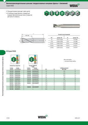 Высокопроизводительные цельные твердосплавные концевые фрезы Высокопроизводительные цельные твердосплавные концевые фрезы • Алюминий Серия D502 • Режущая кромка проходит через центр. • В таблицах представлены стандартные позиции. Дополнительные типы и покрытия доступны по запросу. Tочность изготовления D1 допуск e8 D допуск h6 )3 -0,014/-0,028 )3 0/-0,006 >3–6 -0,020/-0,038 >3–6 0/-0,008 >6–10 -0,025/-0,047 >6–10 0/-0,009 >10–18 -0,032/-0,059 >10–18 0/-0,011 >18–30 -0,040/-0,073 >18–30 0/-0,013 Серия D502 ⅷ лучший выбор ࠗ альтернативный выбор СпБлЕаЗв бПеОзКпРоЫкрТыИтЯия CплTаiвATlNiA-RlNT-RT TiAlN номер номер номер номер глубина резания заказа по каталогу заказа по каталогу D1 D Ap1 max L 1661526 D50203002.. 1602233 D50203002RT 3,0 6 4,00 50 1661530 D50204002.. 1602235 D50204002RT 4,0 6 5,00 54 1661534 D50205002.. 1602236 D50205002RT 5,0 6 6,00 54 1661538 D50206002.. 1661540 D50206002RT 6,0 6 7,00 54 1661543 D50208003.. 1602239 D50208003RT 8,0 8 9,00 58 1661547 D50210004.. 1602240 D50210004RT 10,0 10 11,00 66 1661551 D50212005.. 1602251 D50212005RT 12,0 12 12,00 73 1661555 D50214014.. — 14,0 14 14,00 75 1661560 D50216006.. 1602252 D50216006RT 16,0 16 16,00 82 1661569 D50220007.. — 20,0 20 20,00 92 O134 widia.com