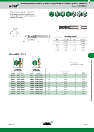 Высокопроизводительные цельные твердосплавные концевые фрезы Высокопроизводительные цельные твердосплавные концевые фрезы • Алюминий Серии 022814 022817 • Режущая кромка проходит через центр. • В таблицах представлены стандартные позиции. Дополнительные типы и покрытия доступны по запросу. Вид X Tочность изготовления D1 допуск h10 D допуск h6 X )3 0/-0,040 )3 0/-0,006 >3–6 0/-0,048 >3–6 0/-0,008 >6–10 0/-0,058 >6–10 0/-0,009 >10–18 0/-0,070 >10–18 0/-0,011 >18–30 0/-0,084 >18–30 0/-0,013 Серии 022814 022817 ⅷ лучший выбор ࠗ альтернативный выбор CплKа1в0KF10F CплKа1в0KF10F Без покрытия Без покрытия номер номер номер номер глубина резания заказа по каталогу заказа по каталогу D1 D Ap1 max L BCH 2332369 022814-000040 2332410 022817-000040 4,0 6 8,00 57 0,10 2332370 022814-000050 2332411 022817-000050 5,0 6 10,00 57 0,10 2332371 022814-000060 2332412 022817-000060 6,0 6 10,00 57 0,10 2332372 022814-000080 2332413 022817-000080 8,0 8 16,00 63 0,10 2332373 022814-000100 2332414 022817-000100 10,0 10 19,00 72 0,10 2332374 022814-000120 2332415 022817-000120 12,0 12 22,00 83 0,20 2332375 022814-000140 2332416 022817-000140 14,0 14 22,00 83 0,20 2332376 022814-000160 2332417 022817-000160 16,0 16 26,00 92 0,20 2332377 022814-000180 2332418 022817-000180 18,0 18 26,00 92 0,20 2332378 022814-000200 2332419 022817-000200 20,0 20 32,00 104 0,20 widia.com O135