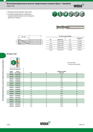 Высокопроизводительные цельные твердосплавные концевые фрезы Высокопроизводительные цельные твердосплавные концевые фрезы • Алюминий Серия 4102 • Режущая кромка проходит через центр. • В таблицах представлены стандартные позиции. Дополнительные типы и покрытия доступны по запросу. Tочность изготовления допуск h6 D1 допуск e8 D +/- )3 -0,014/-0,028 )3 0/-0,006 >3–6 -0,020/-0,038 >3–6 0/-0,008 >6–10 -0,025/-0,047 >6–10 0/-0,009 >10–18 -0,032/-0,059 >10–18 0/-0,011 >18–30 -0,040/-0,073 >18–30 0/-0,013 Серия 4102 ⅷ лучший выбор ࠗ альтернативный выбор СпБлЕаЗв ПбеОзКпРоЫкТрИыЯтия номер номер глубина резания заказа по каталогу D1 D Ap1 max L 1656432 410201000.. 1,0 3 4,00 38 1656436 410201500.. 1,5 3 6,00 38 1656440 410202000.. 2,0 3 8,00 38 1656444 410202500.. 2,5 3 9,00 38 1656448 410203000.. 3,0 3 12,00 38 1656454 410204001.. 4,0 4 12,00 50 1656458 410205001.. 5,0 5 14,00 50 1656459 410205002.. 5,0 6 14,00 50 1656464 410206002.. 6,0 6 16,00 50 1656468 410208003.. 8,0 8 20,00 63 1656473 410210004.. 10,0 10 22,00 76 1656478 410212005.. 12,0 12 25,00 76 1656484 410214014.. 14,0 14 32,00 83 1656488 410216006.. 16,0 16 32,00 89 1656492 410218018.. 18,0 18 38,00 100 1656496 410220007.. 20,0 20 38,00 104 O136 widia.com
