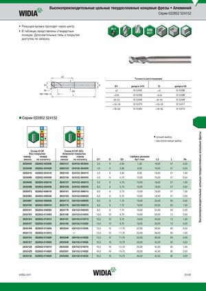 Высокопроизводительные цельные твердосплавные концевые фрезы Высокопроизводительные цельные твердосплавные концевые фрезы • Алюминий Серии 022852 524152 • Режущая кромка проходит через центр. • В таблицах представлены стандартные позиции. Дополнительные типы и покрытия доступны по запросу. Tочность изготовления D1 допуск h10 D допуск h6 )3 0/-0,040 )3 0/-0,006 >3–6 0/-0,048 >3–6 0/-0,008 >6–10 0/-0,058 >6–10 0/-0,009 >10–18 0/-0,070 >10–18 0/-0,011 >18–30 0/-0,084 >18–30 0/-0,013 Серии 022852 524152 ⅷ лучший выбор ࠗ альтернативный выбор СплKа1в0KF10F СплKа1в0KF-1D0CF-LDCL Без покрытия Алмазное покрытие номер номер номер номер глубина резания заказа по каталогу заказа по каталогу D1 D D3 Ap1 max L3 L R¡ 2635004 022852-003005 2635131 524152-003005 3,0 6 2,80 7,00 16,00 57 0,50 2635006 022852-004005 2635153 524152-004005 4,0 6 3,80 8,00 16,00 57 0,50 2635010 022852-004010 2635155 524152-004010 4,0 6 3,80 8,00 16,00 57 1,00 2635063 022852-005005 2635156 524152-005005 5,0 6 4,70 10,00 16,00 57 0,50 2635065 022852-005010 2635157 524152-005010 5,0 6 4,70 10,00 16,00 57 1,00 2635068 022852-006005 2635158 524152-006005 6,0 6 5,70 10,00 19,00 57 0,50 2635072 022852-006010 2635161 524152-006010 6,0 6 5,70 10,00 19,00 57 1,00 2635094 022852-006020 2635162 524152-006020 6,0 6 5,70 10,00 19,00 57 2,00 2635097 022852-008005 2635173 524152-008005 8,0 8 7,70 16,00 25,00 63 0,50 2635100 022852-008010 2635175 524152-008010 8,0 8 7,70 16,00 25,00 63 1,00 2635101 022852-008020 2635176 524152-008020 8,0 8 7,70 16,00 25,00 63 2,00 2635103 022852-010005 2635180 524152-010005 10,0 10 9,70 19,00 30,00 72 0,50 2635104 022852-010010 2635181 524152-010010 10,0 10 9,70 19,00 30,00 72 1,00 2635107 022852-010020 2635193 524152-010020 10,0 10 9,70 19,00 30,00 72 2,00 2635109 022852-012005 2635344 524152-012005 12,0 12 11,70 22,00 36,00 83 0,50 2635110 022852-012010 — 12,0 12 11,70 22,00 36,00 83 1,00 2635124 022852-012020 2635348 524152-012020 12,0 12 11,70 22,00 36,00 83 2,00 2635127 022852-016005 2635349 524152-016005 16,0 16 15,70 26,00 42,00 92 0,50 2635128 022852-016010 2635350 524152-016010 16,0 16 15,70 26,00 42,00 92 1,00 2635129 022852-016020 2635351 524152-016020 16,0 16 15,70 26,00 42,00 92 2,00 2635130 022852-016030 2635383 524152-016030 16,0 16 15,70 26,00 42,00 92 3,00 widia.com O137