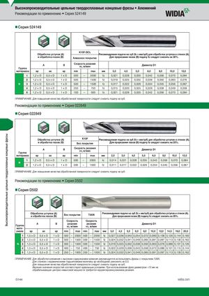 Высокопроизводительные цельные твердосплавные концевые фрезы Высокопроизводительные цельные твердосплавные концевые фрезы • Алюминий Рекомендации по применению • Серия 524149 Серия 524149 K10F-DCL Обработка уступов (A) Рекомендуемая подача на зуб (fz = мм/зуб) для обработки уступов и стенок (A). и обработка пазов (B) Алмазное покрытие Для прорезания пазов (B) подачу fz следует снизить на 20%. AГруппа B Скорость резанияvc, м/мин Диаметр D1 материала ap ae ap min max мм 3,0 4,0 5,0 6,0 8,0 10,0 12,0 1 1,2 x D 0,5 x D 1xD 500 – 2000 fz 0,021 0,028 0,035 0,042 0,056 0,070 0,084 2 1,2 x D 0,5 x D 1xD 500 – 1500 fz 0,019 0,025 0,032 0,038 0,050 0,063 0,076 N 3 1,2 x D 0,5 x D 1xD 500 – 1500 fz 0,017 0,022 0,028 0,034 0,045 0,056 0,067 4 1,2 x D 0,5 x D 1xD 250 – 750 fz 0,015 0,020 0,025 0,029 0,039 0,049 0,059 6 1,2 x D 0,5 x D 1xD 100 – 500 fz 0,021 0,028 0,035 0,042 0,056 0,070 0,084 ПРИМЕЧАНИЕ. Для повышения качества обработанной поверхности следует снизить подачу на зуб. Рекомендации по применению • Серия 022849 Серия 022849 Обработка уступов (A) K10F Рекомендуемая подача на зуб (fz = мм/зуб) для обработки уступов и стенок (A). и обработка пазов (B) Без покрытия Для прорезания пазов (B) подачу fz следует снизить на 20%. AГруппа B Скорость резанияvc, м/мин Диаметр D1 материала ap ae ap min max мм 2,0 3,0 4,0 5,0 6,0 8,0 10,0 12,0 1 1,2 x D 0,5 x D 1xD 500 – 2000 fz 0,014 0,021 0,028 0,035 0,042 0,056 0,070 0,084 N 2 1,2 x D 0,5 x D 1xD 500 – 1500 fz 0,011 0,017 0,022 0,028 0,034 0,045 0,056 0,067 ПРИМЕЧАНИЕ. Для повышения качества обработанной поверхности следует снизить подачу на зуб. Рекомендации по применению • Серия D502 Серия D502 Обработка уступов (A)и обработка пазов (B)Без покрытияTiAlNРекомендуемая подача на зуб (fz = мм/зуб) для обработки уступов и стенок (A).Для прорезания пазов (B) подачу fz следует снизить на 20%. Скорость Скорость Группа A B резания резанияvc, м/минvc, м/мин Диаметр D1 мате- риала ap ae ap min max min max мм 3,0 4,0 5,0 6,0 8,0 10,0 12,0 14,0 16,0 20,0 1 1,5 x D 0,5 x D 1xD 500 – 2000 500 – 2000 fz 0,027 0,036 0,045 0,054 0,072 0,090 0,108 0,126 0,144 0,180 2 1,5 x D 0,5 x D 1xD 500 – 1500 500 – 1500 fz 0,024 0,032 0,041 0,049 0,065 0,081 0,097 0,113 0,130 0,162 N 3 1,5 x D 0,5 x D 1xD 500 – 1500 500 – 1500 fz 0,019 0,025 0,032 0,038 0,050 0,063 0,076 0,088 0,101 0,126 4 1,5 x D 0,5 x D 1xD 400 – 750 400 – 750 fz 0,022 0,029 0,036 0,043 0,058 0,072 0,086 0,101 0,115 0,144 5 1,5 x D 0,5 x D 1xD 250 – 1000 250 – 1000 fz 0,024 0,032 0,041 0,049 0,065 0,081 0,097 0,113 0,130 0,162 ПРИМЕЧАНИЕ. Для обработки алюминия с высоким содержанием кремния рекомендуется использовать фрезы с покрытием TiAlN. Для станков с керамическими подшипниками величину ap необходимо умножить на 0,5. Для повышения качества обработанной поверхности следует снизить подачу на зуб. Верхние значения скоростей соответствуют идеальным условиям. При использовании фрез диаметром >12 мм на обрабатывающих центрах невысокой мощности требуется корректировка режимов резания. O144 widia.com