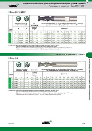 Высокопроизводительные цельные твердосплавные концевые фрезы Высокопроизводительные цельные твердосплавные концевые фрезы • Алюминий Рекомендации по применению • Серии 022814 022817 Серии 022814 022817 Обработка уступов (A) K10F Рекомендуемая подача на зуб (fz = мм/зуб) для обработки уступов и стенок (A). и обработка пазов (B) Без покрытия Для прорезания пазов (B) подачу fz следует снизить на 20%. Скорость Группа Aмате- B резанияvc, м/мин Диаметр D1 риала ap ae ap min max мм 4,0 5,0 6,0 8,0 10,0 12,0 14,0 16,0 18,0 20,0 1 1,5 x D 0,5 x D 1xD 500 – 2000 fz 0,036 0,045 0,054 0,072 0,090 0,108 0,126 0,144 0,162 0,180 2 1,5 x D 0,5 x D 1xD 500 – 1500 fz 0,032 0,041 0,049 0,065 0,081 0,097 0,113 0,130 0,146 0,162 N 3 1,5 x D 0,5 x D 1xD 500 – 1500 fz 0,025 0,032 0,038 0,050 0,063 0,076 0,088 0,101 0,113 0,126 4 1,5 x D 0,5 x D 1xD 400 – 750 fz 0,029 0,036 0,043 0,058 0,072 0,086 0,101 0,115 0,130 0,144 5 1,5 x D 0,5 x D 1xD 250 – 1000 fz 0,032 0,041 0,049 0,065 0,081 0,097 0,113 0,130 0,146 0,162 ПРИМЕЧАНИЕ. Для станков с керамическими подшипниками величину ap необходимо умножить на 0,5. Для повышения качества обработанной поверхности следует снизить подачу на зуб. Верхние значения скоростей соответствуют идеальным условиям. При использовании фрез диаметром >12 мм на обрабатывающих центрах невысокой мощности требуется корректировка режимов резания. Рекомендации по применению • Серия 4102 Серия 4102 Обработка уступов (A)и обработка пазов (B)Без покрытияРекомендуемая подача на зуб (fz = мм/зуб) для обработки уступов и стенок (A).Для прорезания пазов (B) подачу fz следует снизить на 20%. Скорость Группа Aмате- B резанияvc, м/мин Диаметр D1 риала ap ae ap min max мм 1,5 2,0 3,0 4,0 6,0 8,0 10,0 12,0 16,0 18,0 20,0 1 1,5 x D 0,5 x D 1xD 500 – 2000 fz 0,014 0,018 0,027 0,036 0,054 0,072 0,090 0,108 0,144 0,162 0,180 2 1,5 x D 0,5 x D 1xD 500 – 1500 fz 0,012 0,016 0,024 0,032 0,049 0,065 0,081 0,097 0,130 0,146 0,162 N 3 1,5 x D 0,5 x D 1xD 500 – 1500 fz 0,009 0,013 0,019 0,025 0,038 0,050 0,063 0,076 0,101 0,113 0,126 4 1,5 x D 0,5 x D 1xD 400 – 750 fz 0,011 0,014 0,022 0,029 0,043 0,058 0,072 0,086 0,115 0,130 0,144 5 1,5 x D 0,5 x D 1xD 250 – 1000 fz 0,012 0,016 0,024 0,032 0,049 0,065 0,081 0,097 0,130 0,146 0,162 ПРИМЕЧАНИЕ. Для станков с керамическими подшипниками величину ap необходимо умножить на 0,5. Для повышения качества обработанной поверхности следует снизить подачу на зуб. Верхние значения скоростей соответствуют идеальным условиям. При использовании фрез диаметром >12 мм на обрабатывающих центрах невысокой мощности требуется корректировка режимов резания. widia.com O145