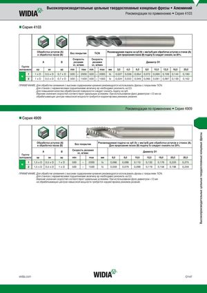 Высокопроизводительные цельные твердосплавные концевые фрезы Высокопроизводительные цельные твердосплавные концевые фрезы • Алюминий Рекомендации по применению • Серия 4103 Серия 4103 Обработка уступов (A)и обработка пазов (B)Без покрытияTiCNРекомендуемая подача на зуб (fz = мм/зуб) для обработки уступов и стенок (A).Для прорезания пазов (B) подачу fz следует снизить на 20%. Скорость Скорость A B резания резания Диаметр D1 vc, м/мин vc, м/мин Группа материала ap ae ap min max min max мм 3,0 4,0 6,0 8,0 10,0 12,0 16,0 20,0 1 1xD 0,5 x D 0,7 x D 500 – 2000 500 – 2000 fz 0,027 0,036 0,054 0,072 0,090 0,108 0,144 0,180 N 2 1xD 0,5 x D 0,7 x D 500 – 1500 500 – 1500 fz 0,024 0,032 0,049 0,065 0,081 0,097 0,130 0,162 ПРИМЕЧАНИЕ. Для обработки алюминия с высоким содержанием кремния рекомендуется использовать фрезы с покрытием TiCN. Для станков с керамическими подшипниками величину ap необходимо умножить на 0,5. Для повышения качества обработанной поверхности следует снизить подачу на зуб. Верхние значения скоростей соответствуют идеальным условиям. При использовании фрез диаметром >12 мм на обрабатывающих центрах невысокой мощности требуется корректировка режимов резания. Рекомендации по применению • Серия 4909 Серия 4909 Обработка уступов (A)и обработка пазов (B)Без покрытияРекомендуемая подача на зуб (fz = мм/зуб) для обработки уступов и стенок (A).Для прорезания пазов (B) подачу fz следует снизить на 20%. A B Скорость резанияvc, м/мин Диаметр D1 Группа материала ap ae ap min max мм 6,0 8,0 10,0 12,0 16,0 20,0 25,0 1 1,5 x D 0,5 x D 1xD 500 – 2000 fz 0,066 0,088 0,110 0,132 0,176 0,220 0,275 N 2 1,5 x D 0,5 x D 1xD 500 – 1500 fz 0,059 0,079 0,099 0,119 0,158 0,198 0,248 ПРИМЕЧАНИЕ. Для обработки алюминия с высоким содержанием кремния рекомендуется использовать фрезы с покрытием TiCN. Для станков с керамическими подшипниками величину ap необходимо умножить на 0,5. Верхние значения скоростей соответствуют идеальным условиям. При использовании фрез диаметром >12 мм на обрабатывающих центрах невысокой мощности требуется корректировка режимов резания. widia.com O147